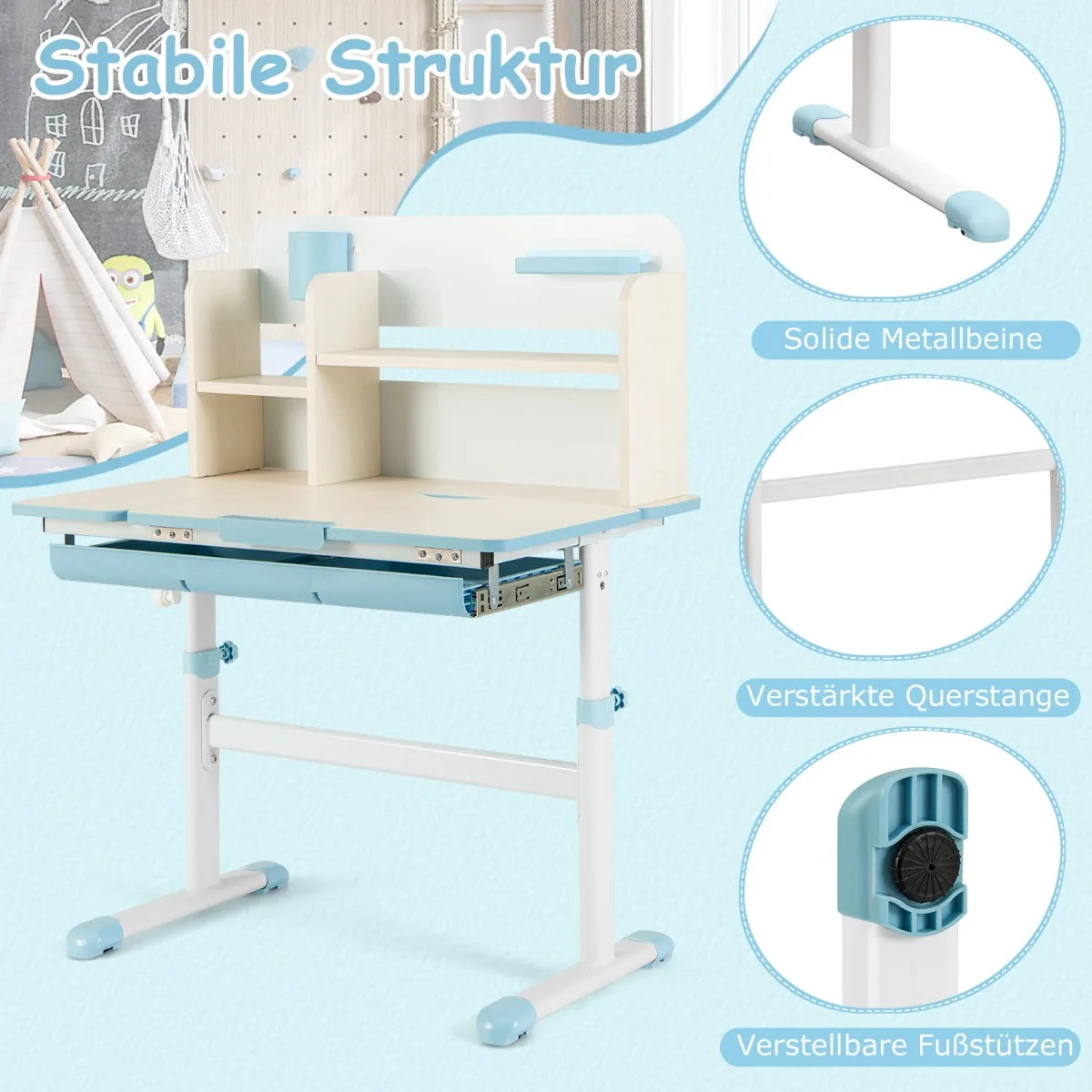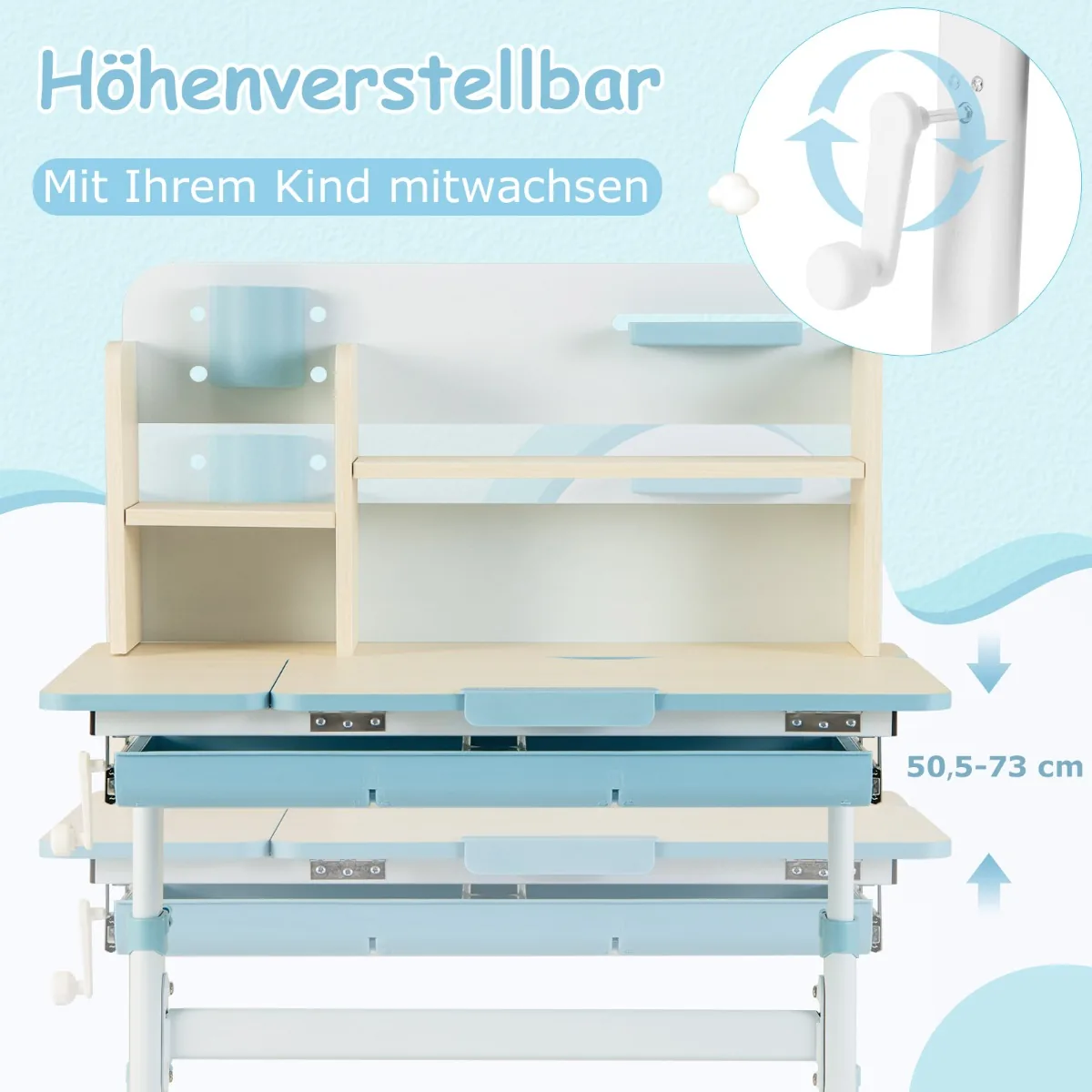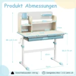 Vaikiškas rašomasis stalas 80x51x110,5 cm, mėlynos spalvos, pritaikytas vaikams nuo 3 iki 12 metų. Reguliuojamo aukščio ir pakreipiamo stalviršio dizainas leidžia prisitaikyti prie vaikų poreikių rašant, piešiant ar skaitant. Stalas turi patogias laikymo vietas ir saugumo funkcijas, užtikrinančias komfortą ir tvarką mokymosi aplinkoje.