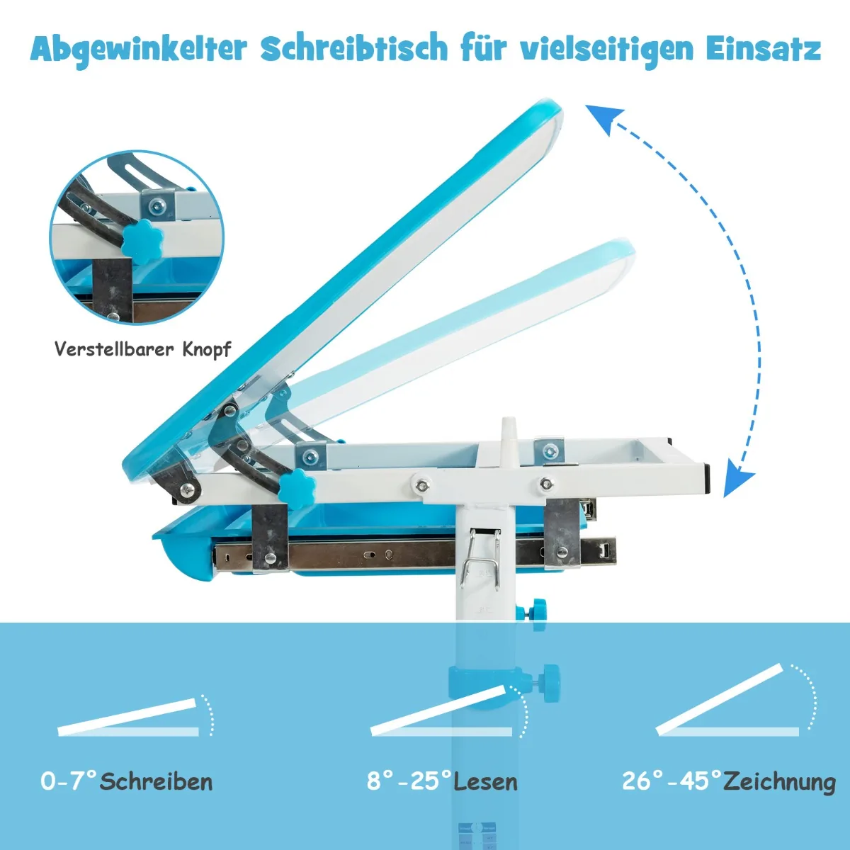 Vaikiškas rašomasis stalas su kėdė mėlynos ir baltos spalvos yra pritaikytas vaikams nuo 4 metų. Komplektas pasižymi reguliuojamu aukščiu, todėl auga kartu su vaiku ir užtikrina ergonomišką sėdėjimą. Kokybiškos medžiagos bei funkcionalios ypatybės padaro šį komplektą patikimu kasdieniam naudojimui.