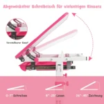 Vaikiškas rašomasis stalas su kėdė rožinės ir baltos spalvos – praktiškas pasirinkimas vaikams nuo 4 metų. Komplektas tinka mokymuisi, piešimui ir laisvalaikiui, nes tiek stalas, tiek kėdė turi reguliuojamą aukštį ir ergonominį dizainą. Tvirta konstrukcija ir patogumas užtikrina ilgalaikį naudojimą bei tinkamą sėdėjimo laikyseną.
