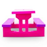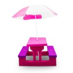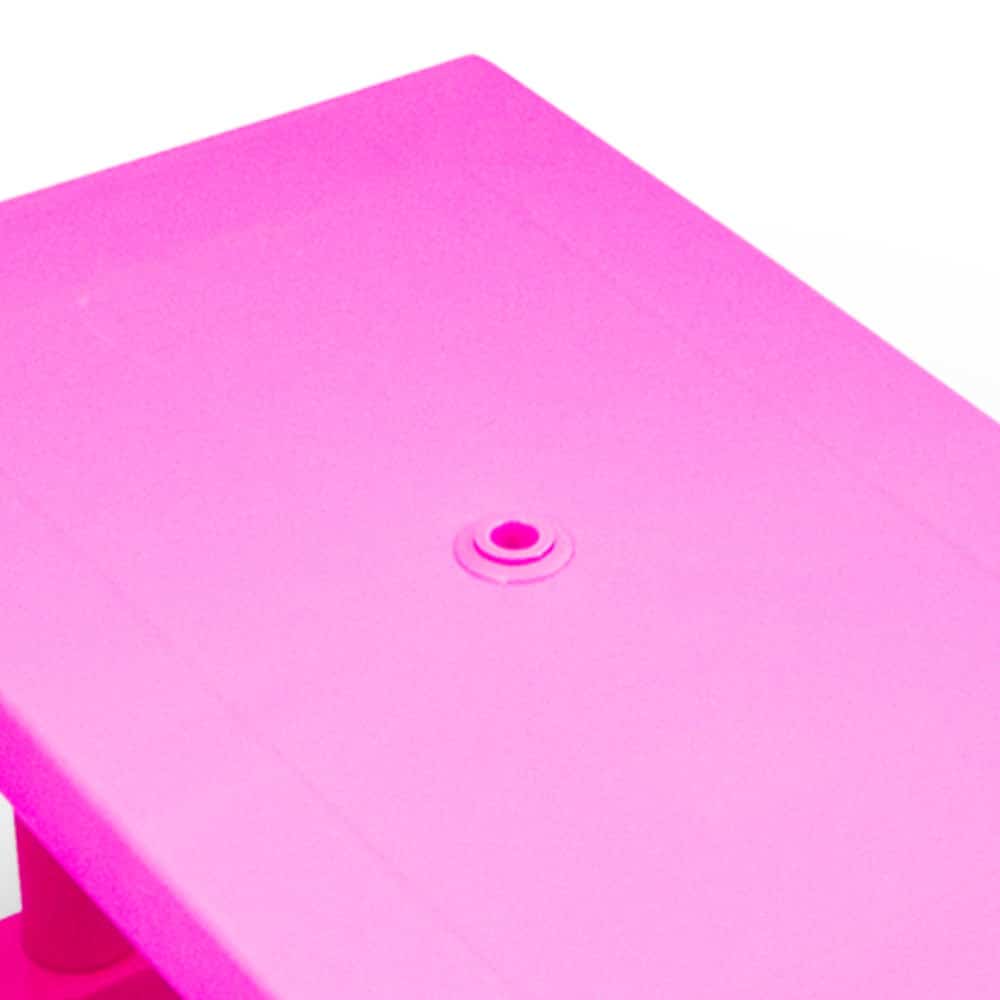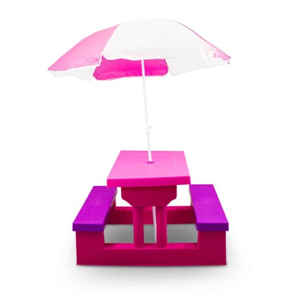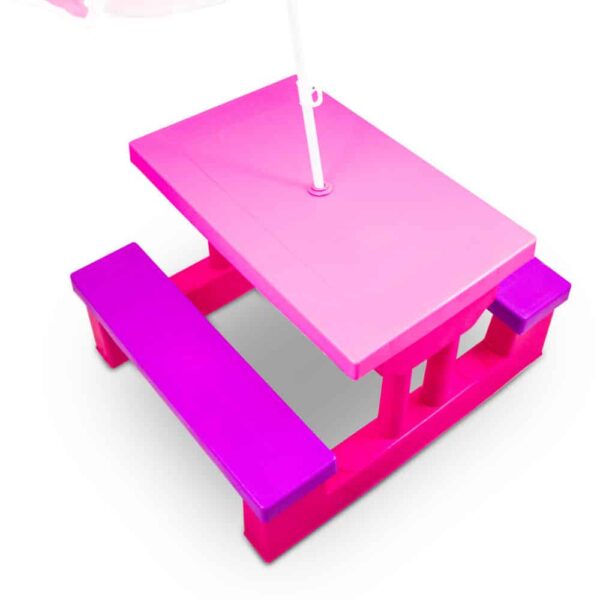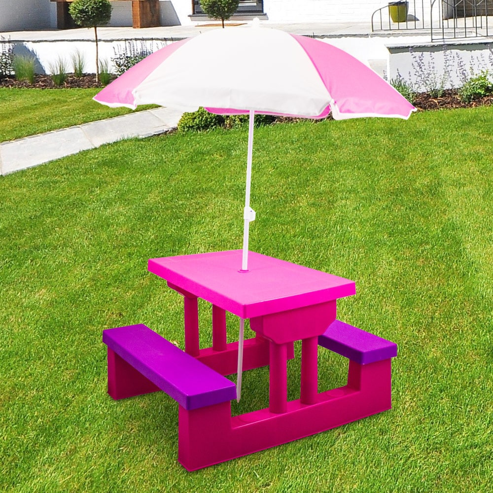Vaikiškas stalas su rožiniu skėčiu ; Ant stalo telpa iki 4 vaikų. Dėl paprastos sistemos skėtis greitai atidaromas ir uždaromas. Sėdynės grupė pagaminta iš polipropileno, todėl yra minkšta ir lengva. Pridedamas skėtis suteikia vaikams šešėlį ir gali būti tvirtai pritvirtintas prie grindų, pvz., sode. Suoliukas gali būti naudojamas tiek sode, tiek darželio kambaryje. Sudėtis: 1x vaikiškas sodo komplektas su skėčiu. Pastaba: netinka vaikams iki 3 metų. Naudokite tik prižiūrint suaugusiems. ; ; Specifikacijos: Bendri matmenys: 67 x 79 x 130 cm (I x P x A), Stalo matmenys: 67 x 41 x 47 cm (P x P x A), Skėčio skersmuo: 105 cm, Sėdynės medžiaga: polipropilenas, Skėčio rėmas medžiaga: metalas, Medžiaga: poliesteris, Svoris: 5,55 kg. ; ; ; ;