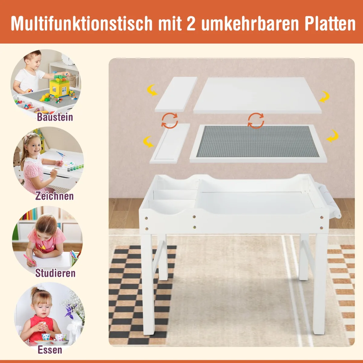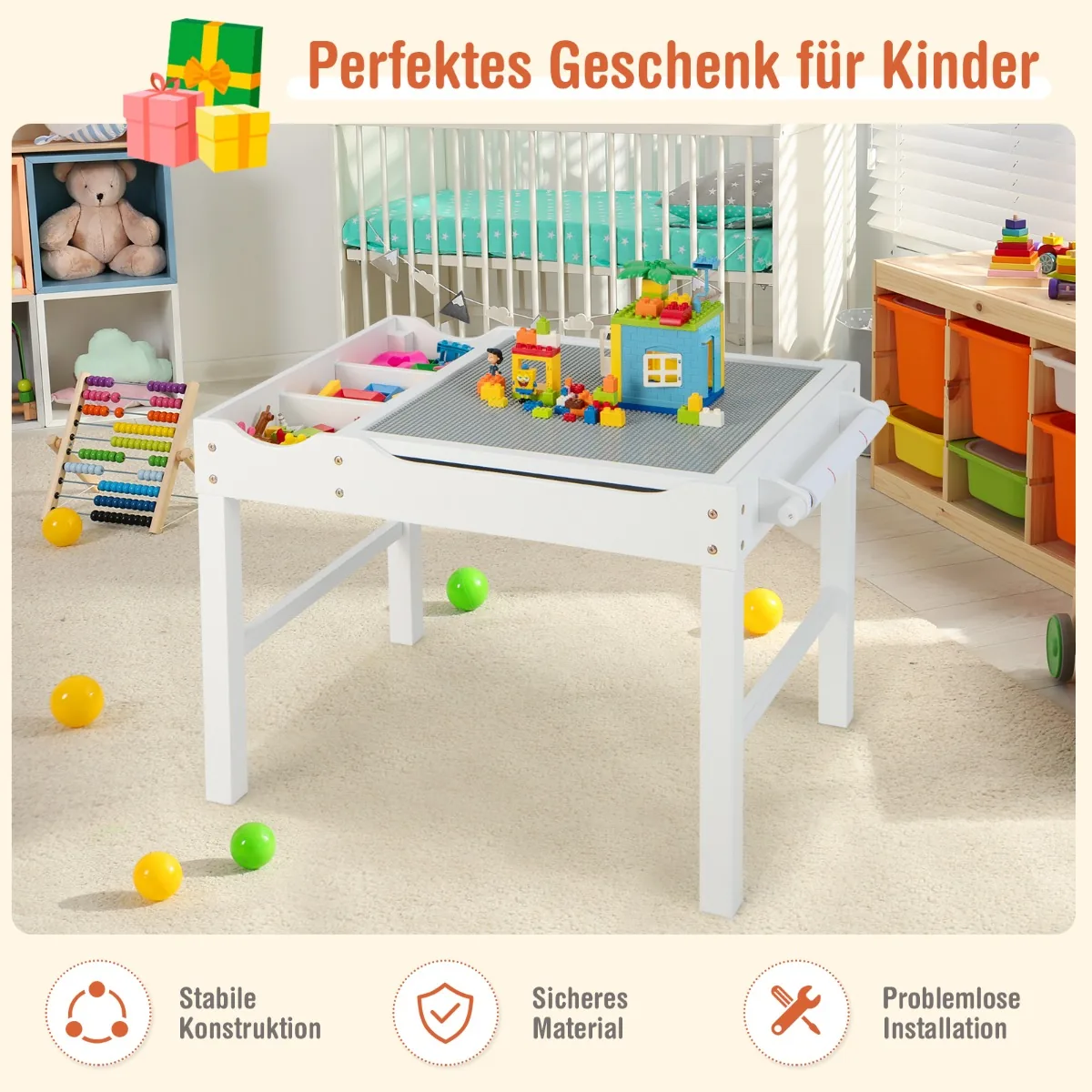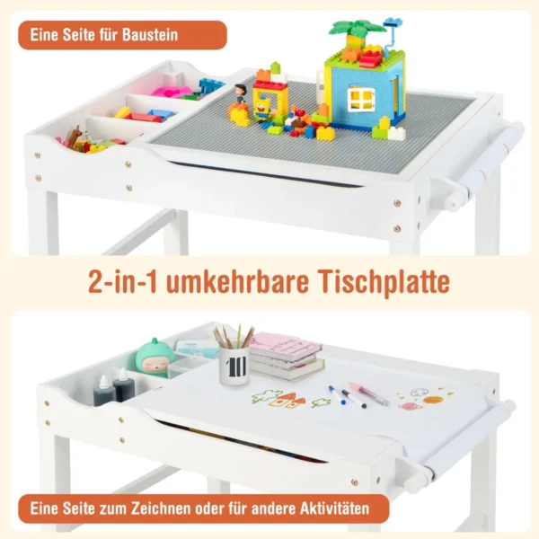 • Dvipusis stalviršis leidžia vaikams naudotis viena puse kaip žaidimų stalu su statybinėmis kaladėlėmis, kita – rašymui, skaitymui ir piešimui.