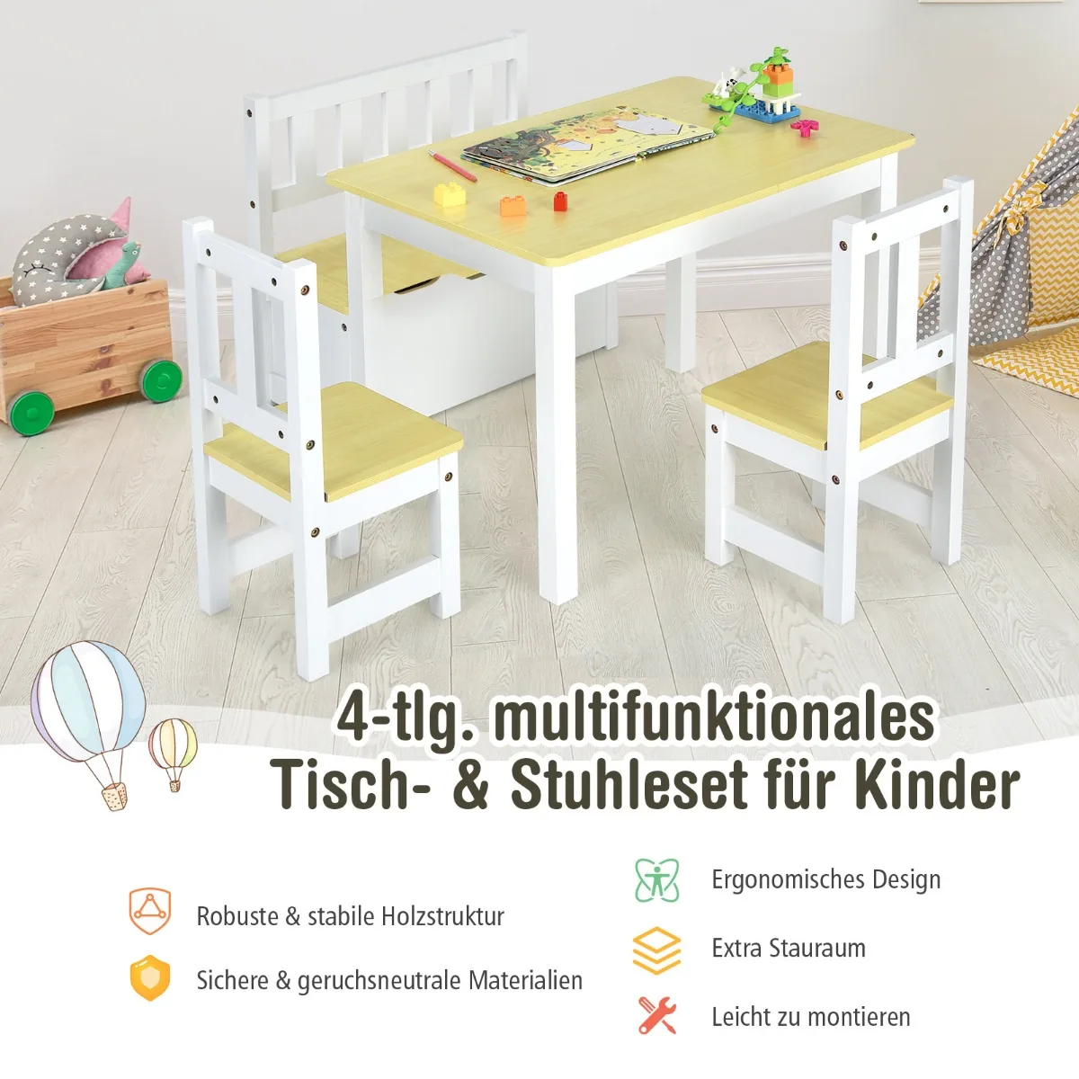 - Komplektą sudaro stalas, suoliukas daiktams laikyti ir dvi kėdės.