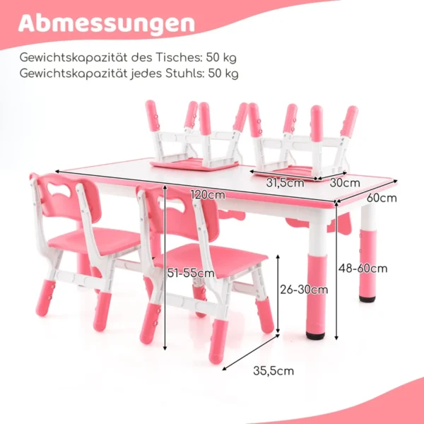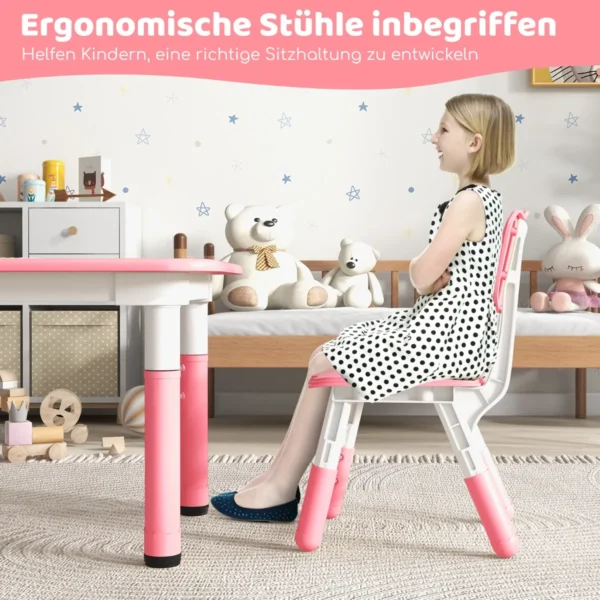 Vaikiškas stalas su 4 kėdėmis rožinės ir baltos spalvos puikiai tinka vaikų kambariui ar žaidimų erdvei. Reguliuojamo aukščio stalas ir ergonomiškos kėdės auga kartu su vaiku, užtikrinant komfortą ir tinkamą sėdėjimo poziciją. Komplektas skirtas piešti, mokytis, žaisti ir valgyti.