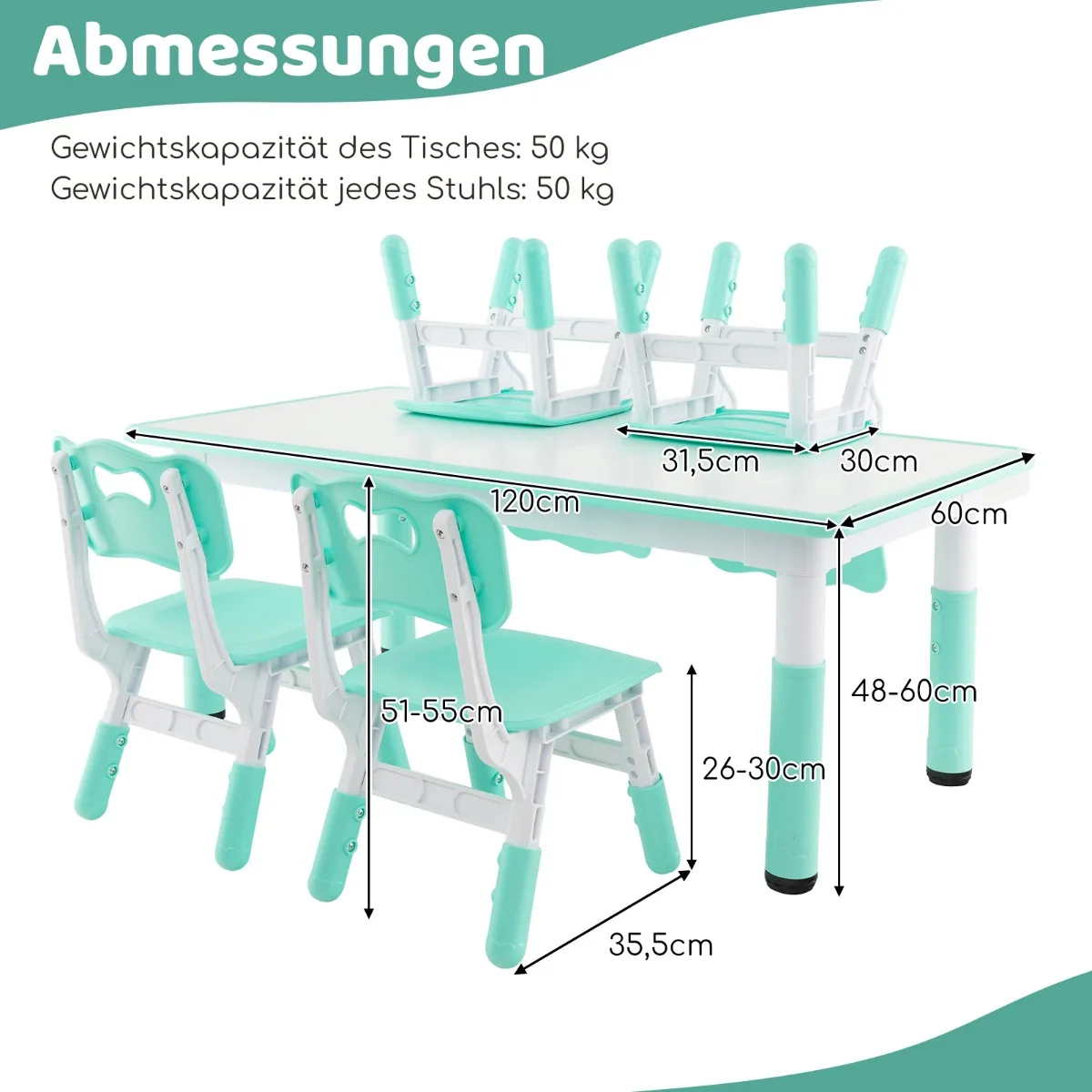 Vaikiškas stalas su 4 kėdėmis žalios ir baltos spalvos puikiai tinka vaikų kambariui ar žaidimų erdvei. Reguliuojamas stalas bei ergonomiškos kėdės prisitaiko prie vaikų ūgio ir auga kartu su jais. Šis komplektas skirtas piešimui, mokymuisi, žaidimams ir poilsiui.