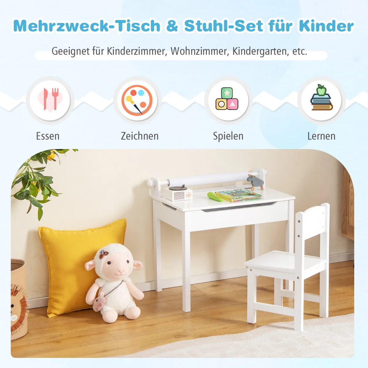 Vaikiškas stalas su kėdė baltos spalvos – funkcionalus baldų komplektas vaikams, skirtas įvairioms veikloms, tokioms kaip piešimas, mokymasis ar žaidimai. Komplekte yra patogus stalviršis su popieriaus ritinio laikikliu ir rašiklio anga, kurie užtikrina tvarkingą darbo vietą vaikui.