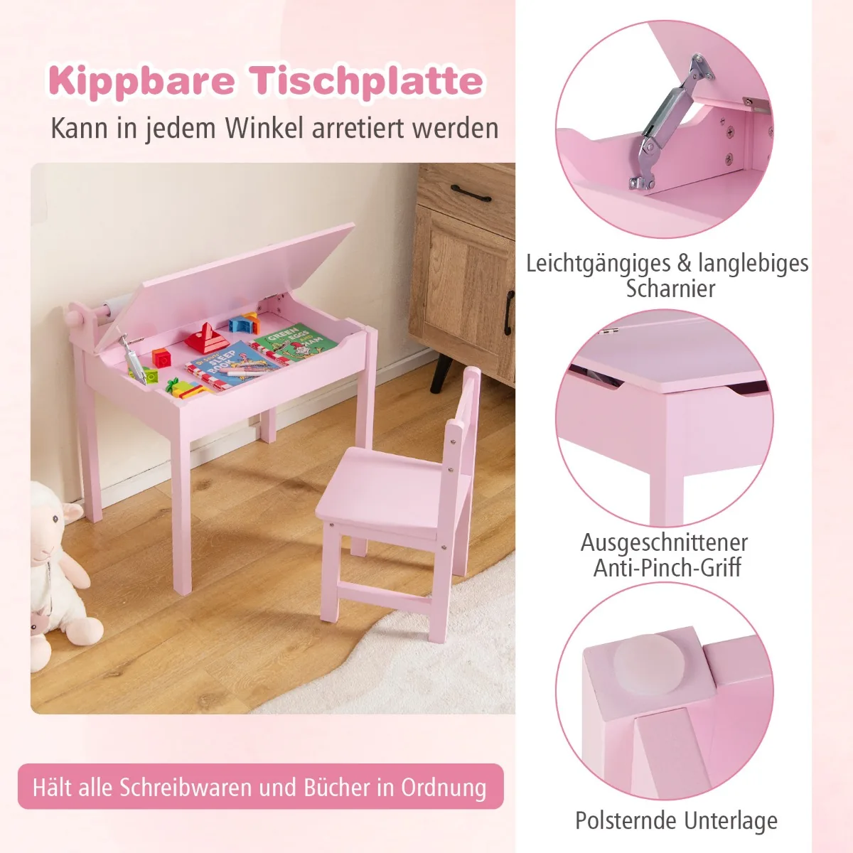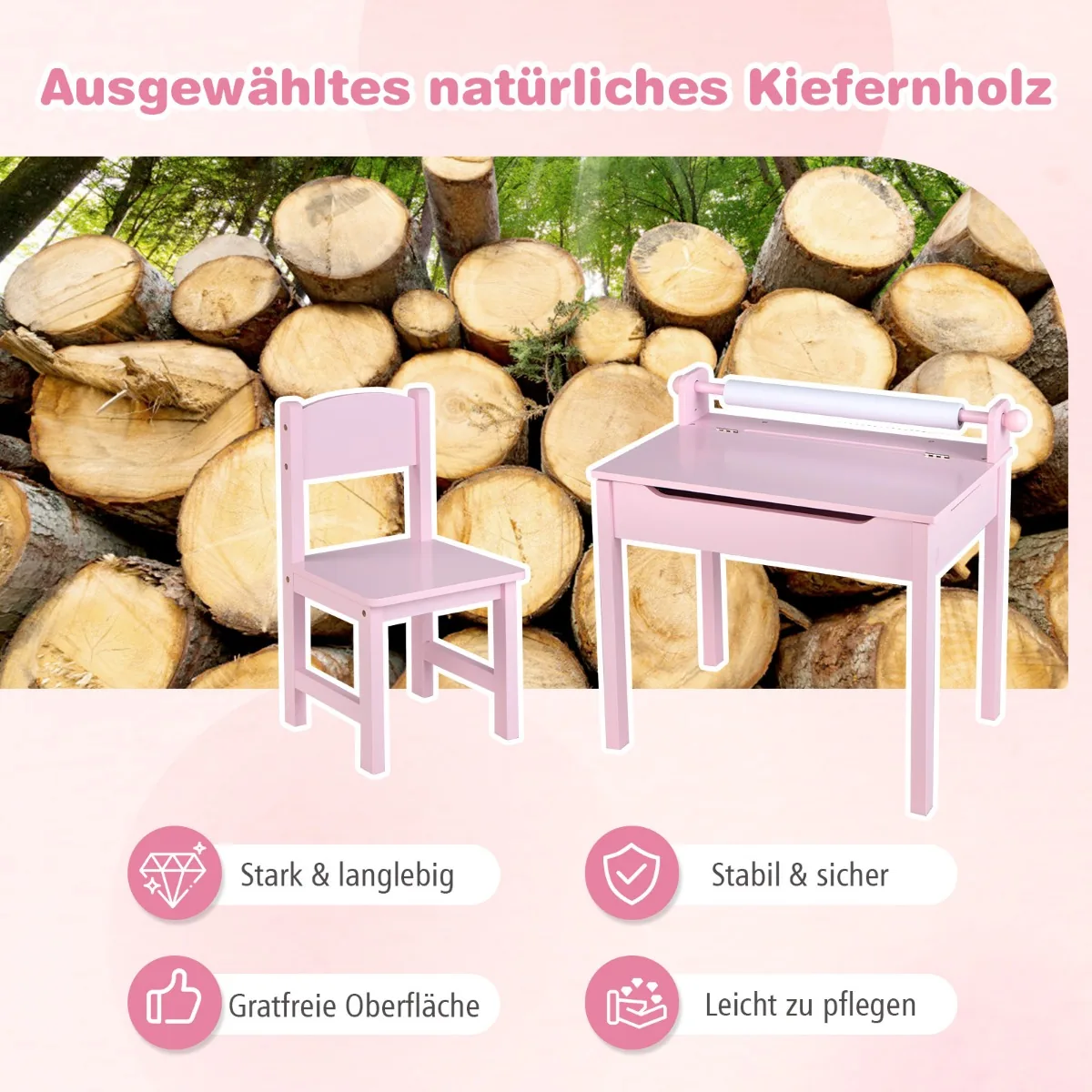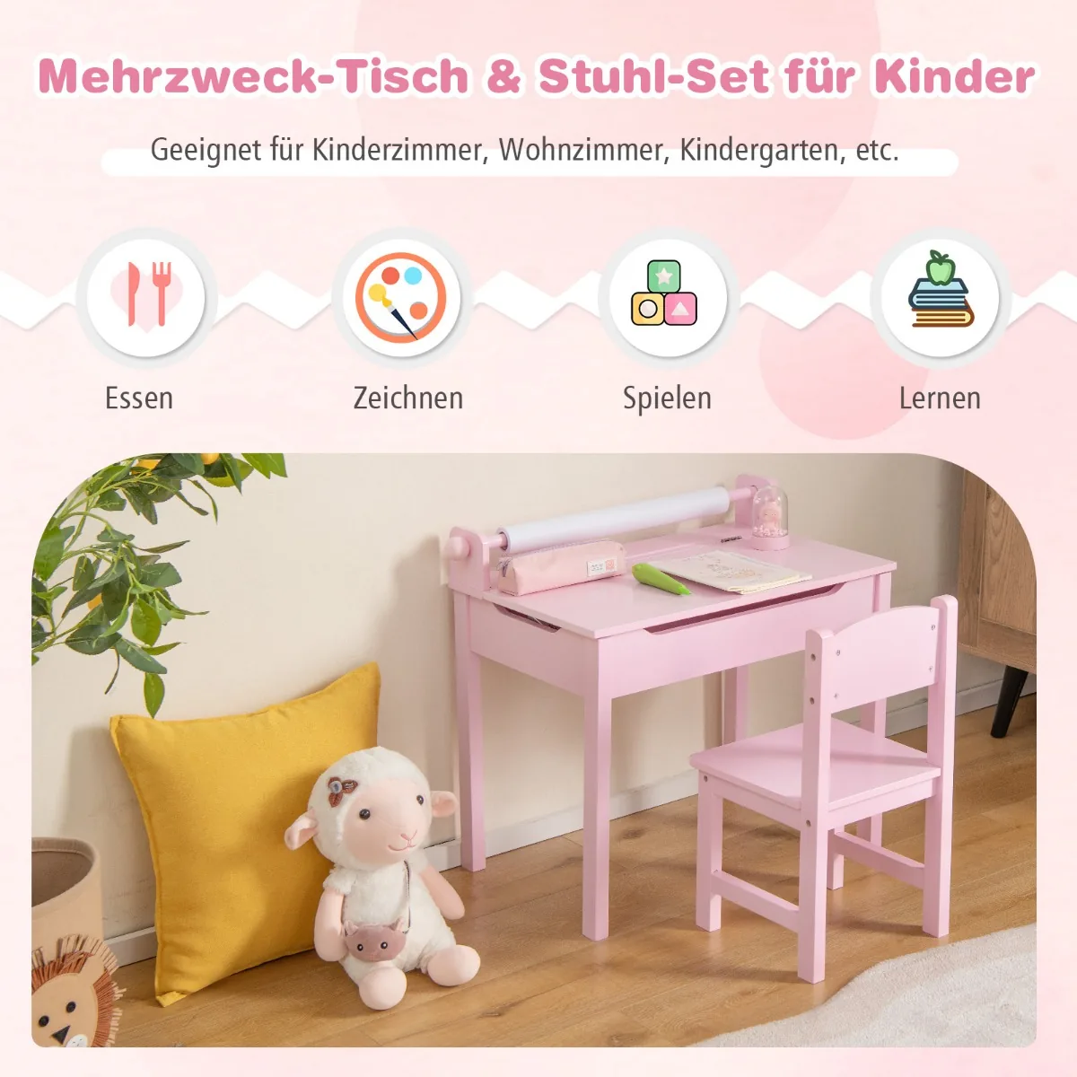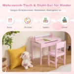 Vaikiškas stalas su kėdė rožinės spalvos skirtas vaikams nuo 3 metų. Komplektas suteikia erdvę kūrybinei veiklai, mokymuisi ir žaidimams namuose ar darželyje. Patogios funkcijos, tokios kaip popieriaus ritinio laikiklis ir rašiklio anga, padeda palaikyti tvarką ir lengvina naudojimą.