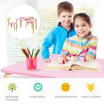 Vaikiškas stalas su kėdė rožinės ir šviesiai rudos spalvos yra funkcionalus pasirinkimas vaikų kambariui ar žaidimų erdvei. Komplektas suteikia patogią ir saugią vietą vaikams valgyti, piešti, skaityti ar žaisti. Pagamintas iš natūralios medienos ir padengtas netoksiškais dažais, jis atitinka vaikų saugumo reikalavimus.