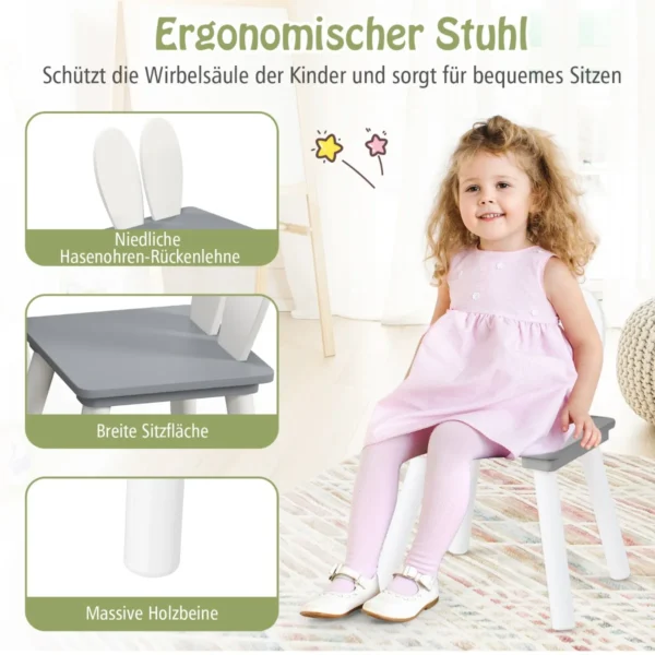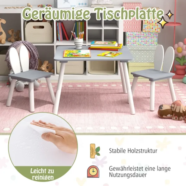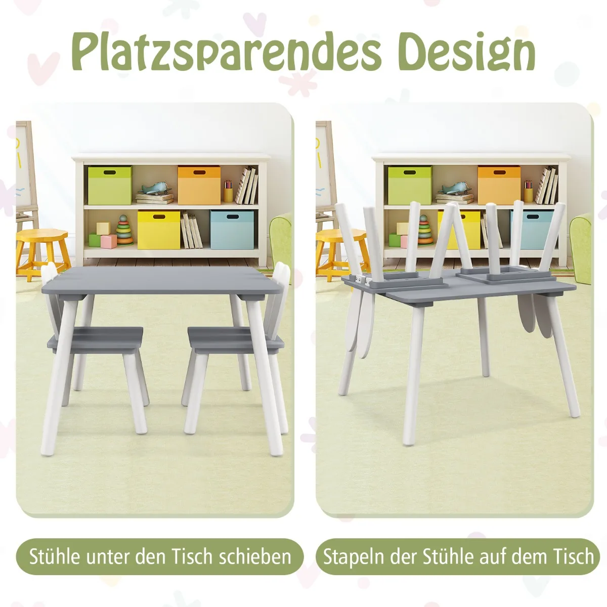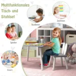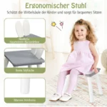 Vaikiškas stalas su kėdėmis baltos ir pilkos spalvos yra funkcionalus komplektas, skirtas vaikų kambariams, žaidimų erdvėms ar darželiams. Komplektą sudaro kvadratinis stalas ir dvi ergonomiškos kėdės, pritaikytos 3–6 metų vaikams kasdienėms veikloms – piešimui, skaitymui, žaidimams ar valgymui.