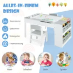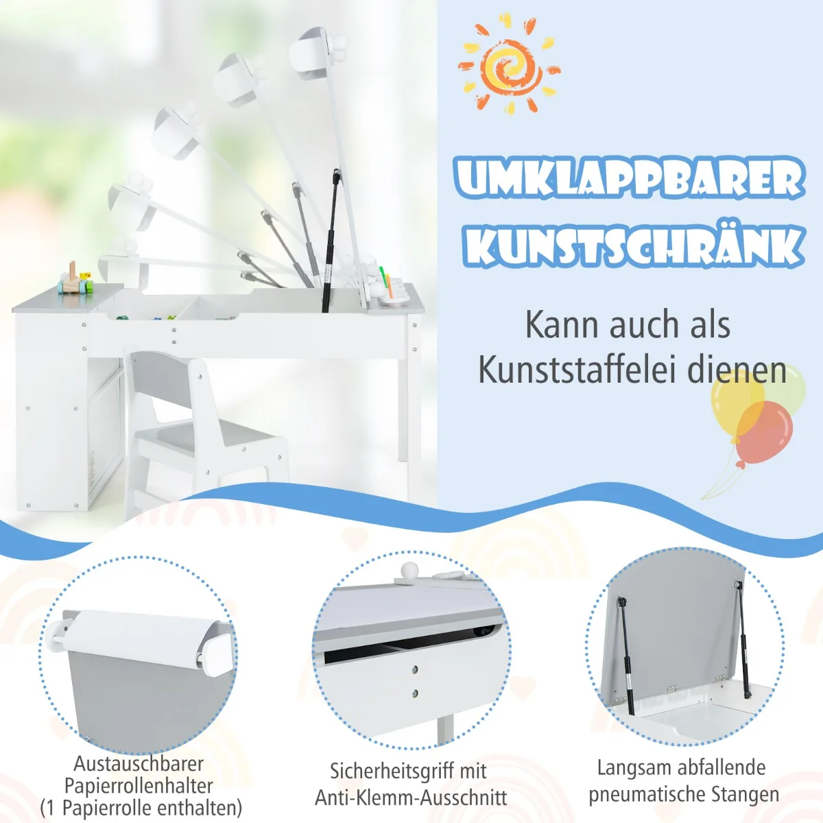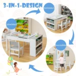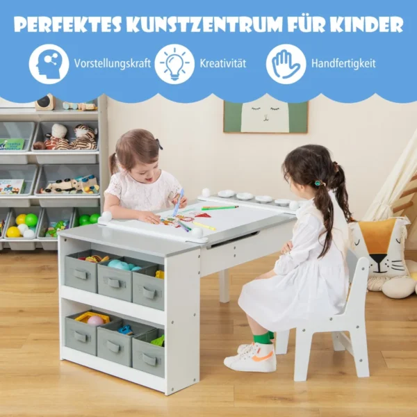 Vaikiškas stalas su kėdėmis baltos ir pilkos spalvos – daugiafunkcis baldų rinkinys vaikų kūrybai ir mokymuisi. Komplekte yra pakeliamas stalviršis, kuris transformuoja stalą į molbertą, todėl jis tinka piešimui, rankdarbiams ir valgymui. Ergonomiškos kėdės užtikrina patogumą ir tinkamą vaikų laikyseną.