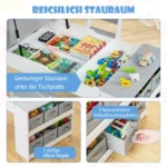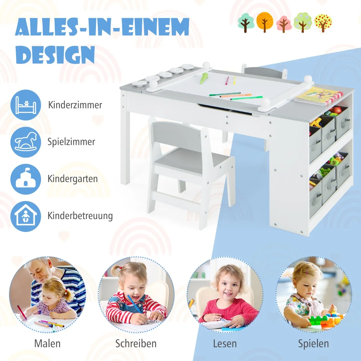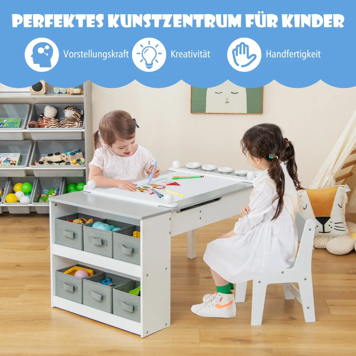 - Daug saugojimo vietos: 6 išimamos medžiaginės dėžutės, 5 dažų puodeliai, paslėptos dėžės po stalviršiu ir lentynos.