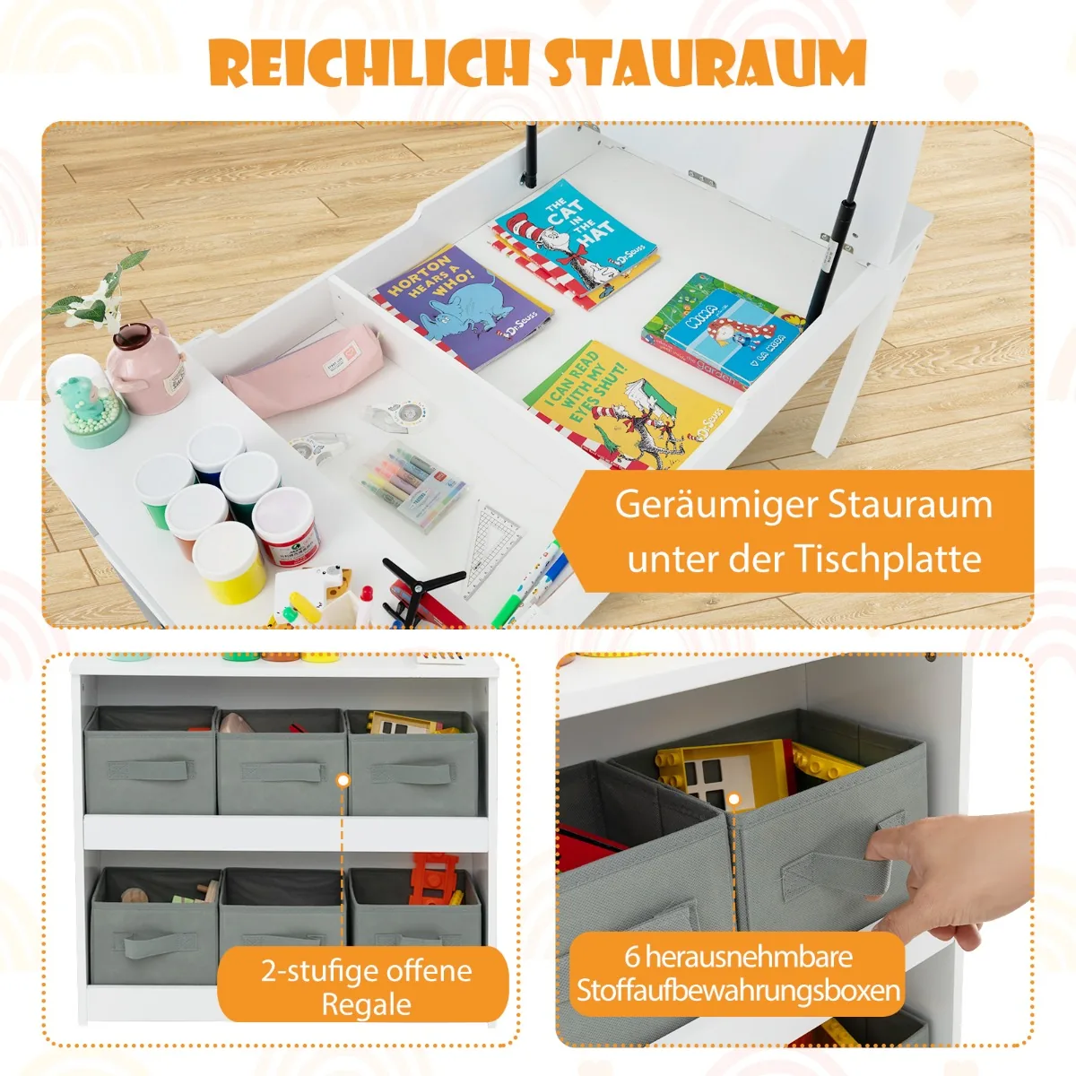 - Daug vietos daiktams: platus stalviršis, paslėpta daiktadėžė po juo, 6 išimamos medžiaginės dėžės su rankenomis, 2 lentynos ir 5 dažų puodeliai.