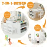 Vaikiškas stalas su kėdėmis baltos spalvos yra daugiafunkcis sprendimas vaikų kambariui ar žaidimų erdvei. Komplekte – pakeliamas stalviršis, leidžiantis stalą naudoti kaip molbertą arba žaidimų stalą. Ergonomiškos kėdės ir patogios daiktadėžių talpos užtikrina patogumą ir tvarką vaikų kūrybinėms veikloms.