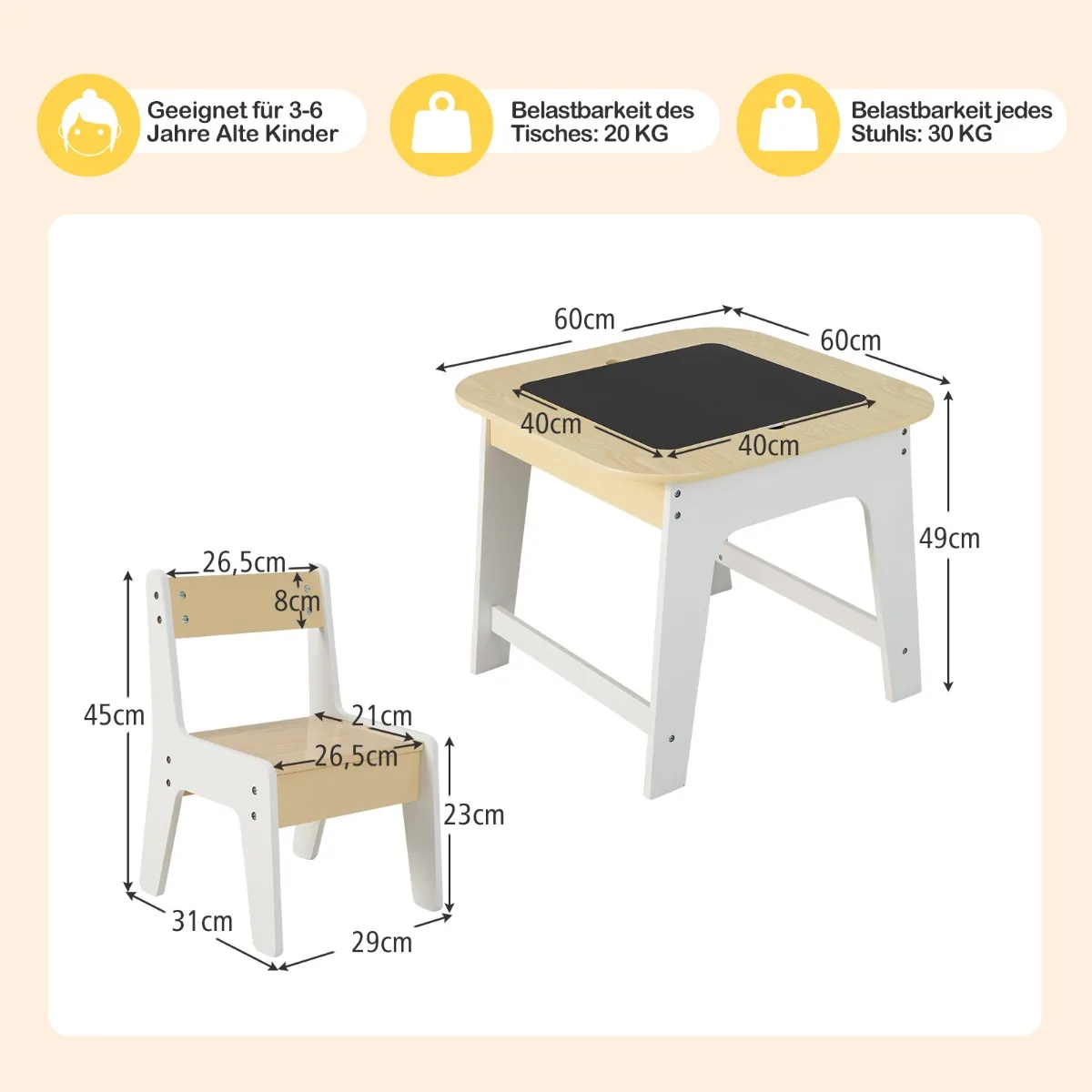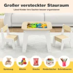 Vaikiškas stalas su kėdėmis baltos ir šviesiai rudos spalvos suteikia vaikams nuo 3 iki 6 metų patogią erdvę žaisti, mokytis, rašyti ar valgyti. Dvipusis stalviršis su lenta ir piešimo lenta skatina kūrybingumą, o paslėpta saugojimo vieta padeda palaikyti tvarką.