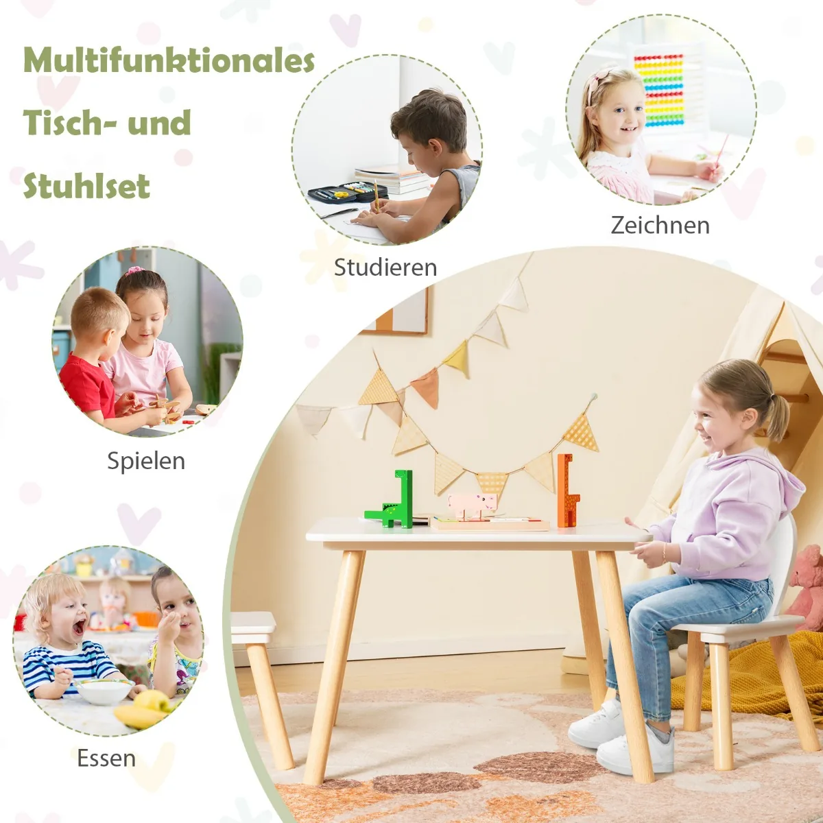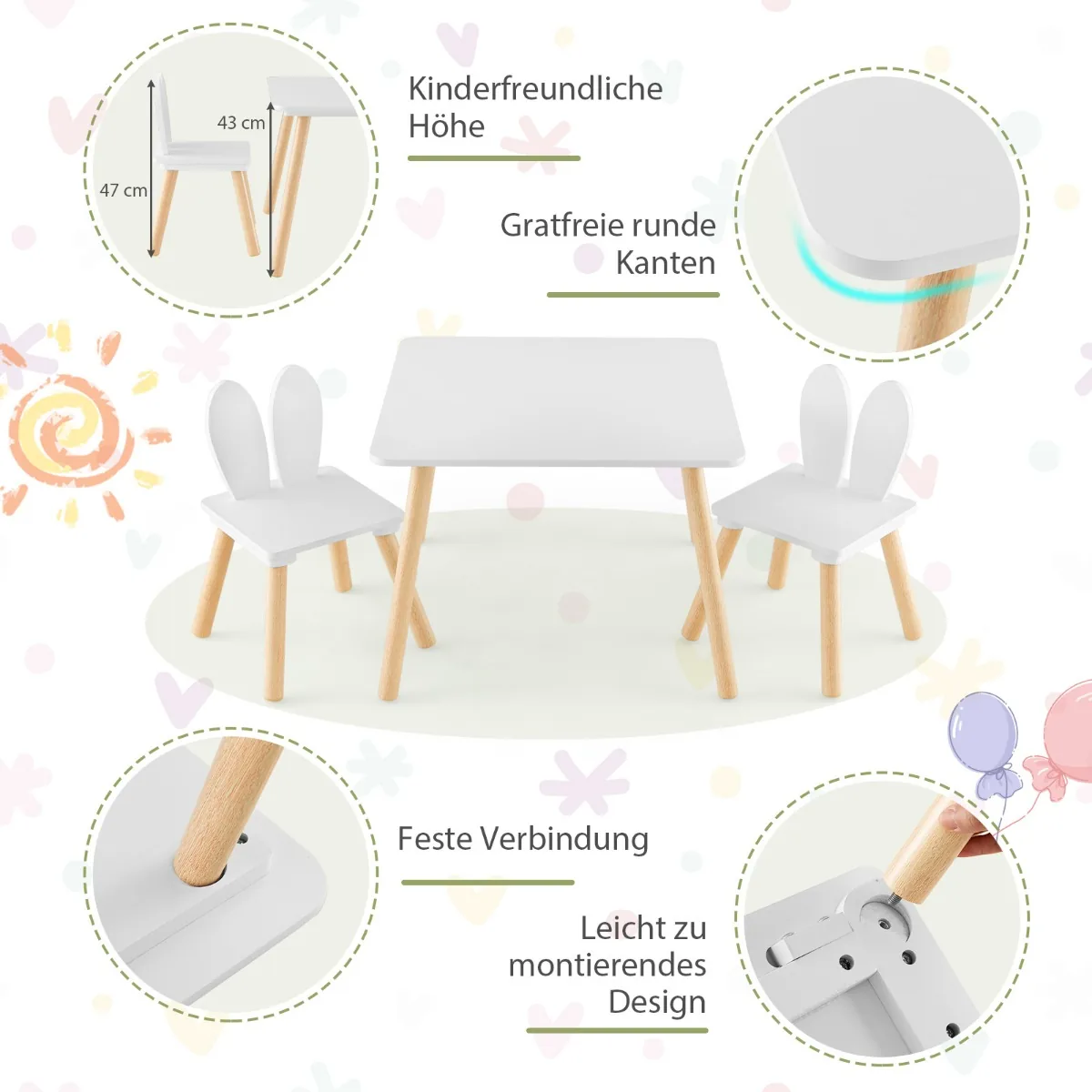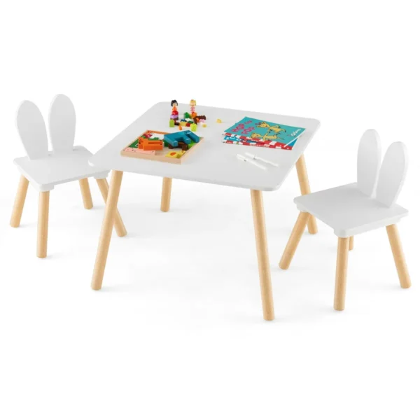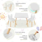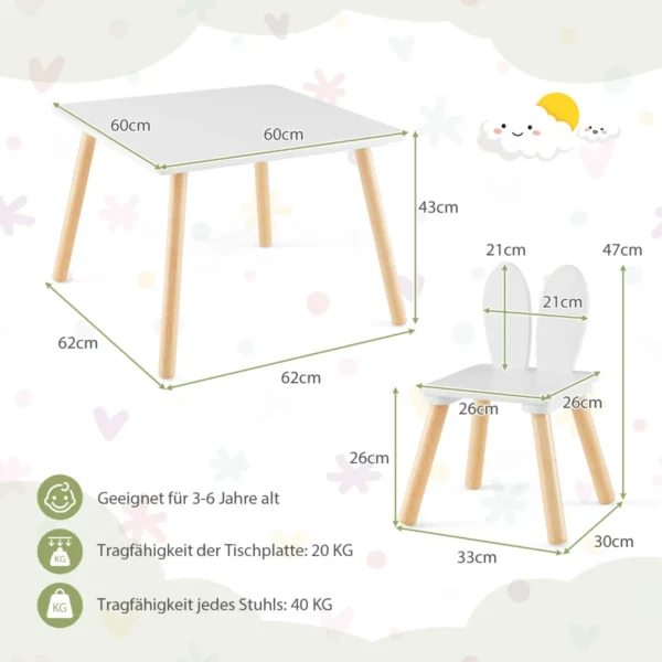- Komplektą sudaro kvadratinis stalas ir 2 kėdės su atlošais, skirtas vaikams nuo 3 iki 6 metų.