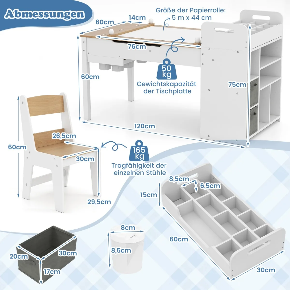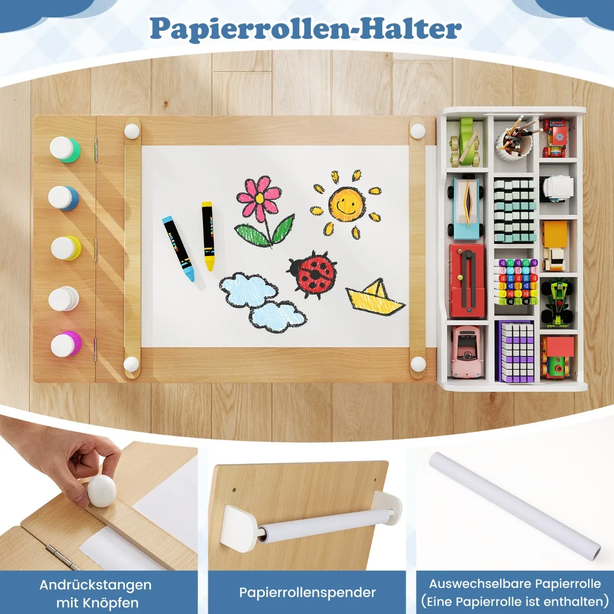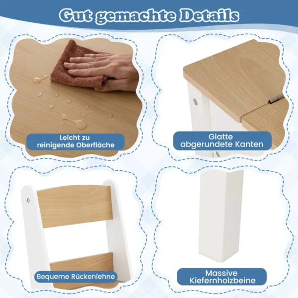 Vaikiškas stalas su kėdėmis baltos ir šviesiai rudos spalvos yra universalus sprendimas vaikų kūrybiškumui skatinti. Komplektas puikiai tinka piešimui, rankdarbiams, mokymuisi ar žaidimams. Baldas pasižymi patogiu popieriaus ritinėlių dozatoriumi ir saugyklos sprendimais.