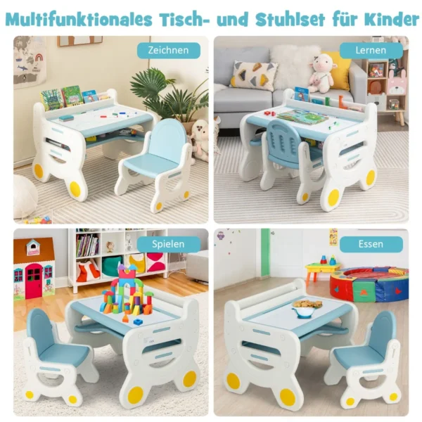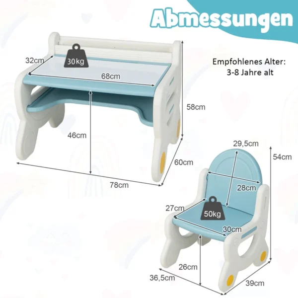 Vaikiškas stalas su kėdėmis – praktinis ir funkcionalus pasirinkimas vaikams nuo 3 iki 8 metų. Šis rinkinys skirtas piešimui, mokymuisi, žaidimams ar valgymui, užtikrinant saugų ir patogų sėdėjimą bei ilgalaikį naudojimą. Komplekte esantis stalviršis yra lengvai valomas ir pritaikytas vaikų kūrybiškumui skatinti.