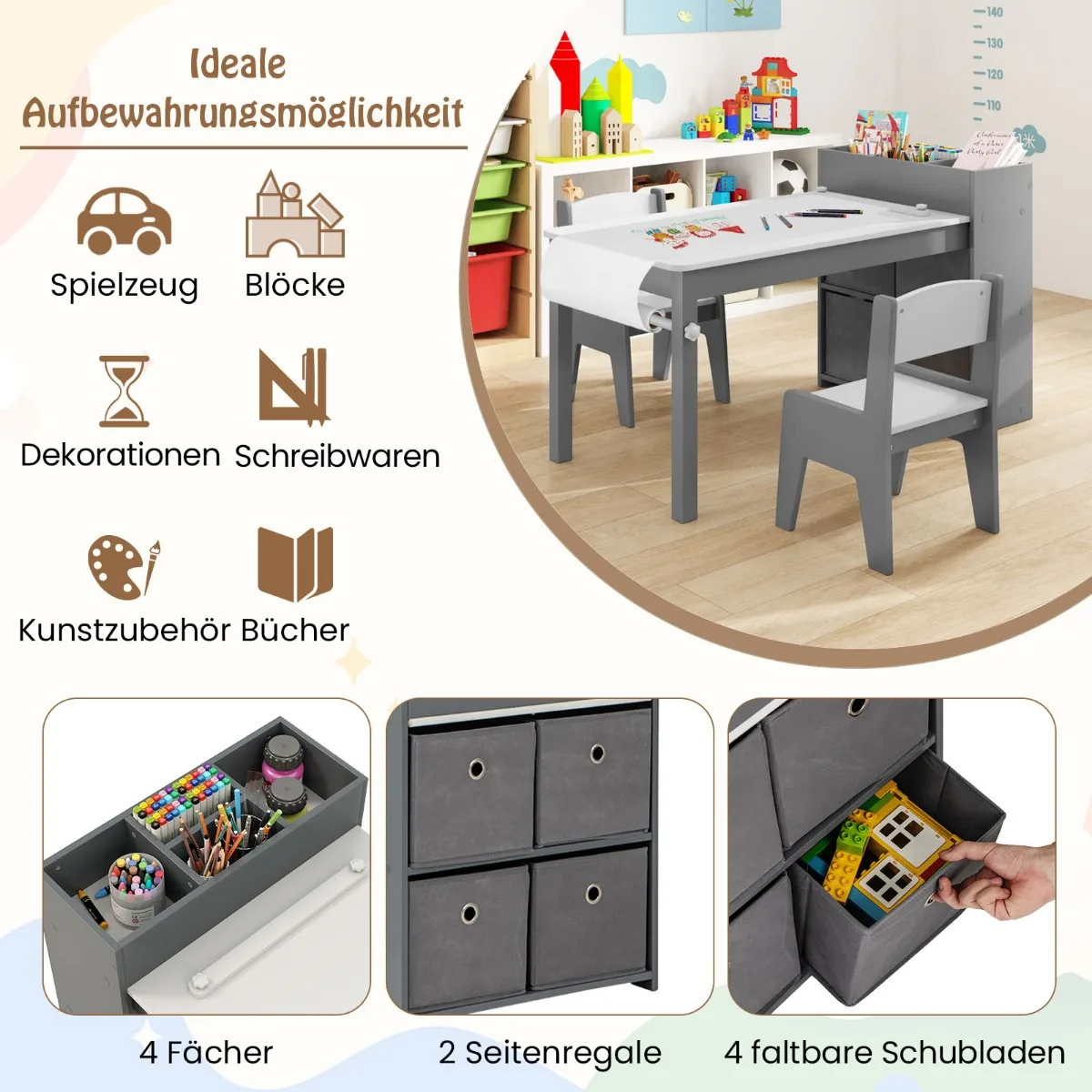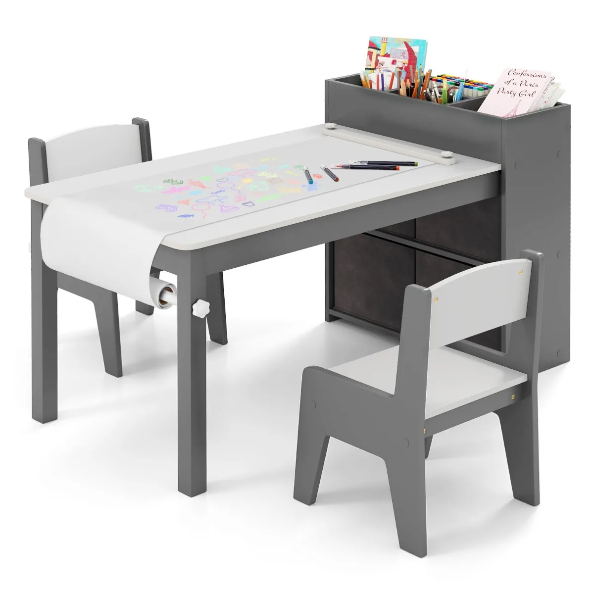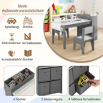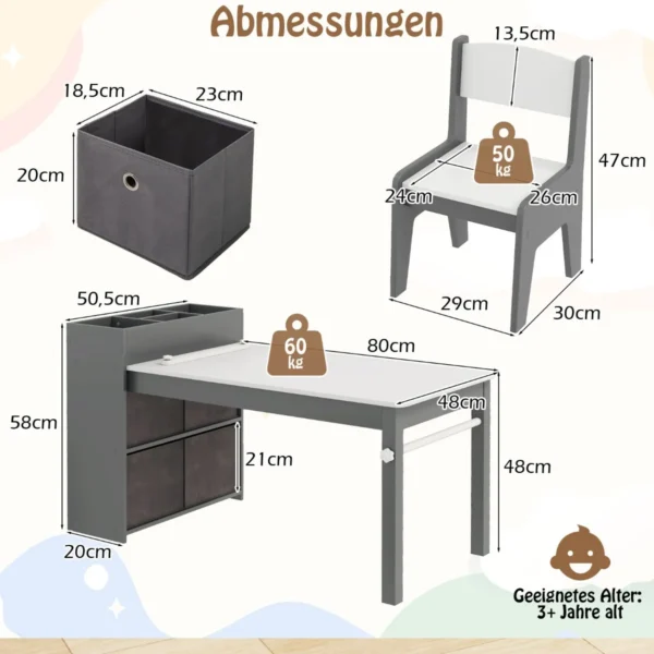 Vaikiškas stalas su kėdėmis pilkos ir baltos spalvos suteikia patogią erdvę vaikų kūrybinei veiklai, mokymuisi ir žaidimams. Komplektas puikiai pritaikytas piešimui, skaitymui, valgyti ar darbui, atitinka vaikų ergonomikos reikalavimus.