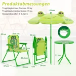 - Vaikiškas lauko komplektas su stalu, 2 sulankstomomis kėdėmis ir reguliuojamu skėčiu.