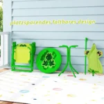Vaikiškas stalas su kėdėmis, žalios spalvos, suteikia patogią ir funkcionalią vietą vaikams žaisti, skaityti ar valgyti. Lengvai sulankstomas ir nešiojamas komplektas idealiai tinka tiek patalpoms, tiek lauko veikloms.