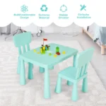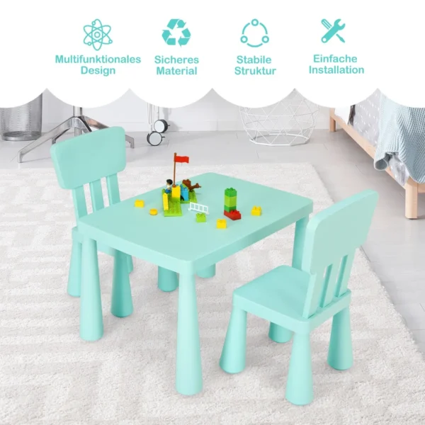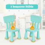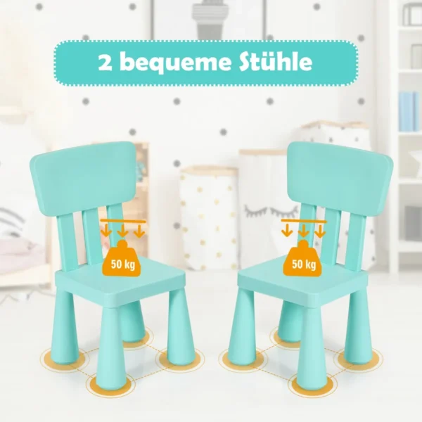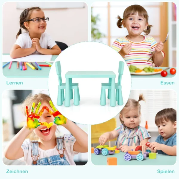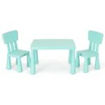 Vaikiškas stalas su kėdėmis, žalios spalvos, suteikia patogią ir saugią erdvę vaikams rašyti, piešti ar valgyti. Komplektą sudaro stalas ir dvi ergonomiškos kėdės, pritaikytos vaikams nuo 1 iki 7 metų. Baldai pagaminti iš netoksiško PP, todėl tinka vaikų kambariui ar žaidimų erdvei.