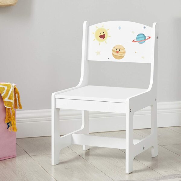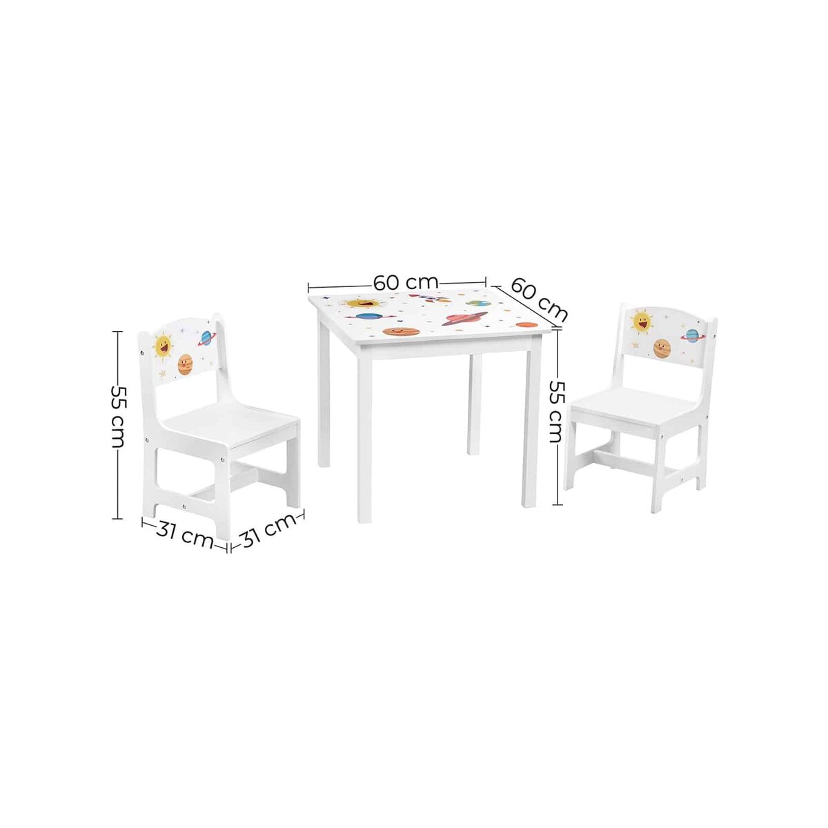 Šis stalo komplektas yra 55 cm aukščio, todėl puikiai tinka mažiesiems. Dėl paprastos struktūros, lengvai vykdomų instrukcijų ir gerai pažymėtų dalių surinkimas yra itin paprastas. Jūsų vaikai galės greitai perimti naują stalą ir kėdes.