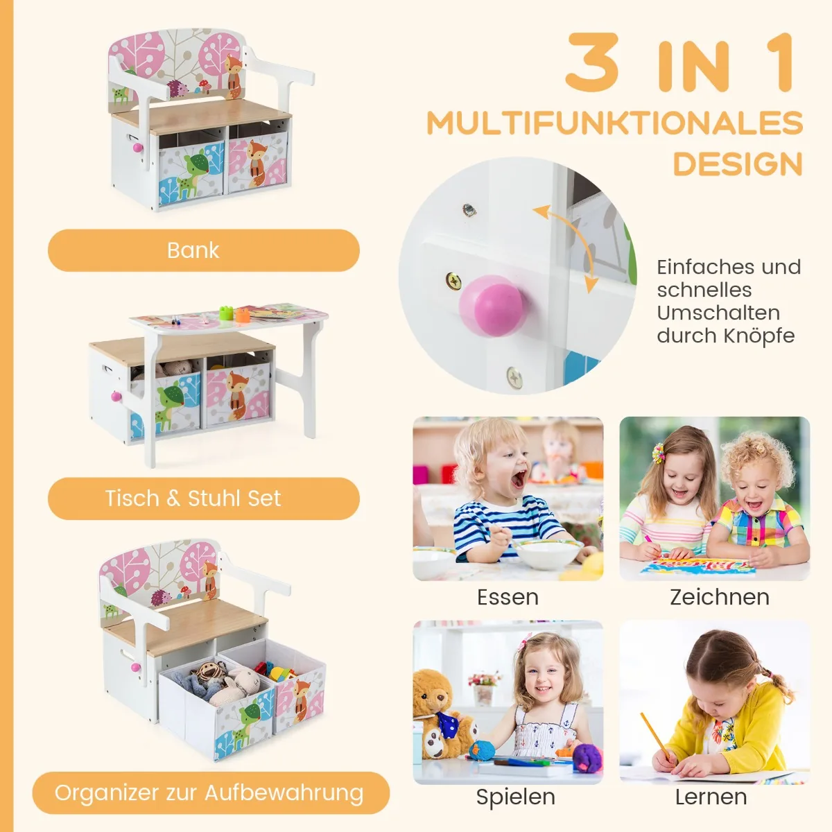 - Suoliukas pritaikomas skirtingoms vaikų veikloms: tapybai, mokymuisi, žaidimams ar užkandžiams.