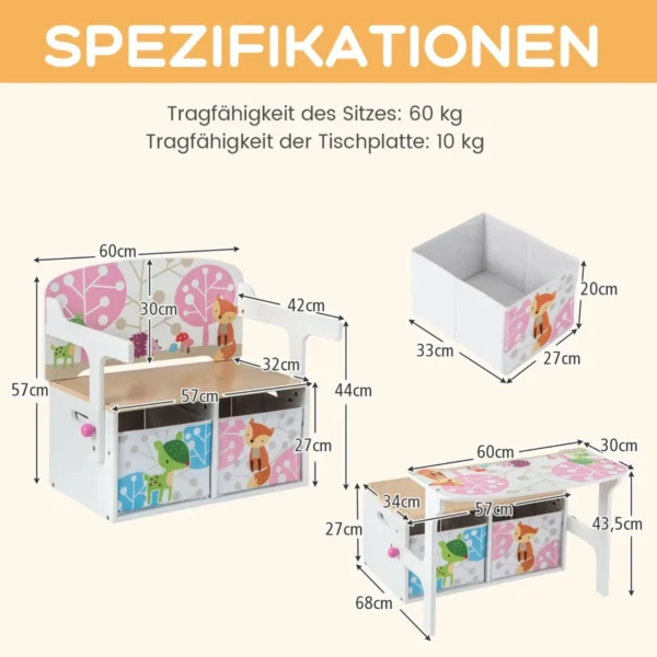 Vaikiškas suoliukas 42x60x57cm, įvairių spalvų, yra universalus ir praktiškas baldas vaikų kambariui arba žaidimų zonai. Šis daugiafunkcis suoliukas puikiai tinka tiek kaip stalo ir kėdžių komplektas, tiek kaip daiktadėžė, leidžianti išlaikyti vaikų daiktus tvarkingai ir organizuotai.