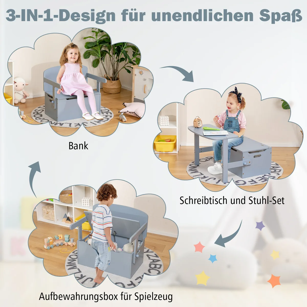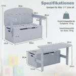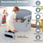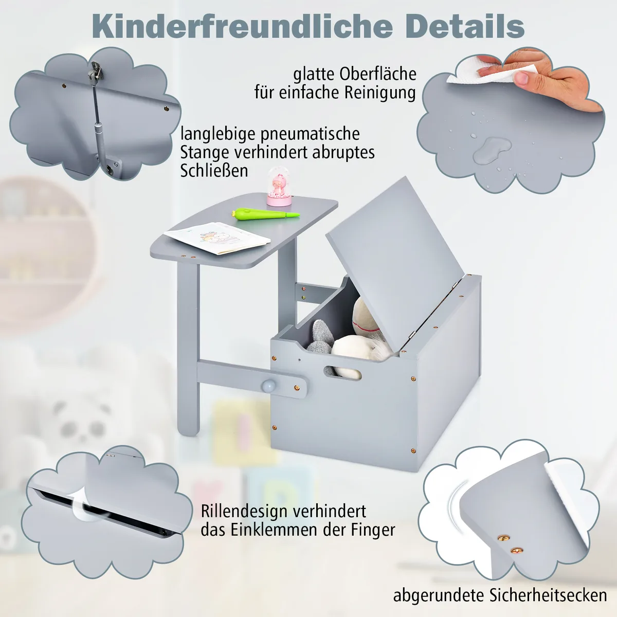 Vaikiškas suoliukas 60x43x57cm pilkos spalvos – funkcionalus ir universalus baldas vaikams nuo 3 iki 7 metų. Suoliukas trys viename puikiai tinka vaikų kambariams, darželiams ar žaidimų erdvėms. Didelė daiktadėžė padeda palaikyti tvarką, o saugos pneumatinis strypas užtikrina lėtą dangčio atidarymą bei uždarymą.