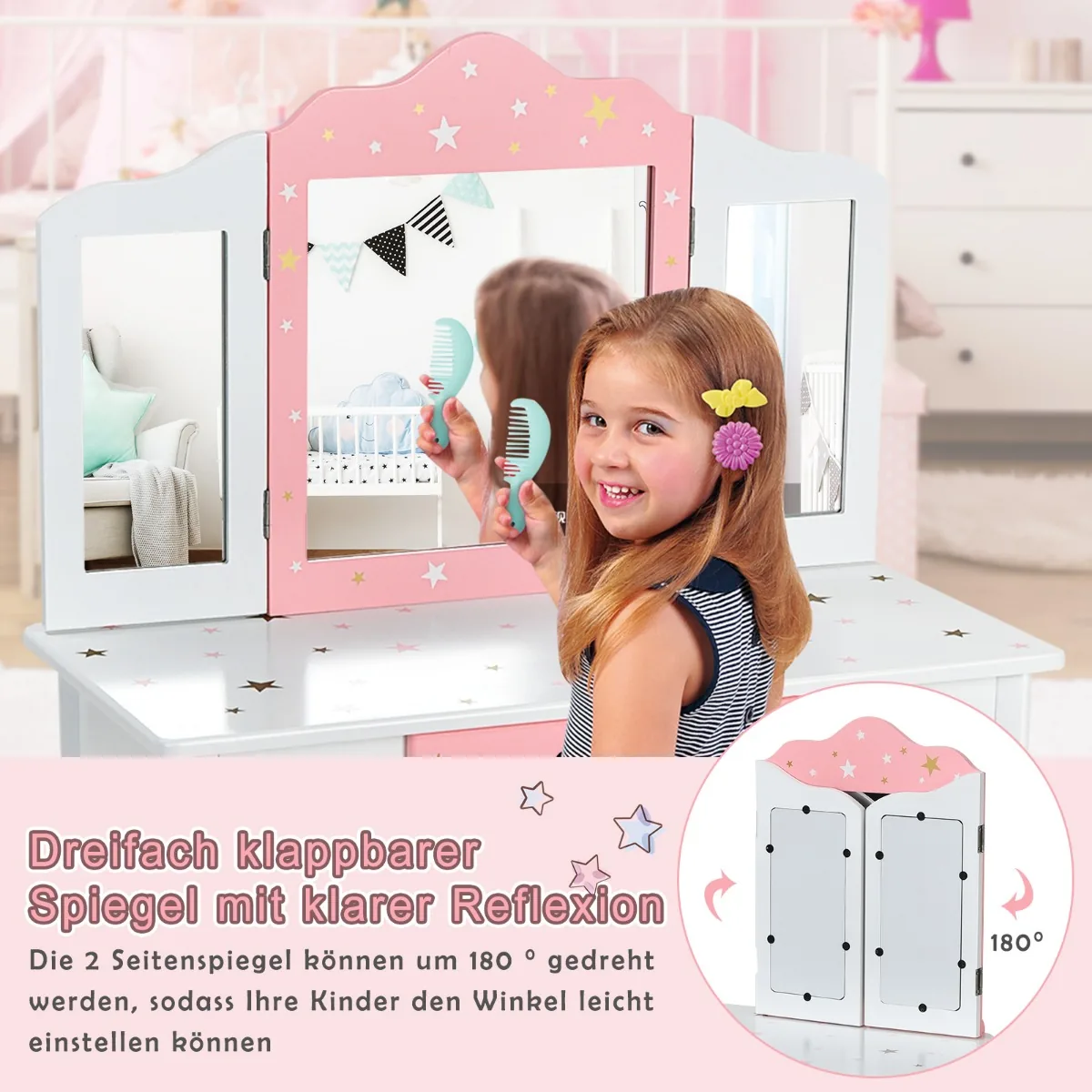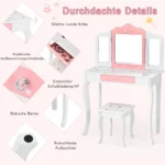 Vaikiškas tualetinis staliukas su kėdute baltos ir rožinės spalvos – praktiškas ir funkcionalus komplektas vaikų kambariui. Dėl sulankstomo veidrodžio ir patogios taburetės staliukas tinka tiek makiažui, tiek mokslui ar žaidimams. Stabilus MDF korpusas ir saugūs suapvalinti kraštai užtikrina saugų naudojimą.
