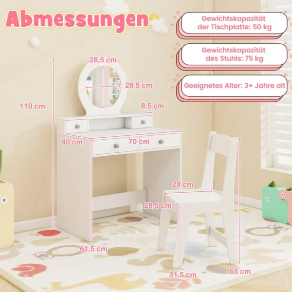 Vaikiškas tualetinis staliukas su kėdute baltos spalvos puikiai tinka vaikų žaidimams, rengtis, piešti ar rašyti. Baldas sukurtas atsižvelgiant į saugumą ir patogumą, todėl yra praktiška ir saugi vaikų erdvė.