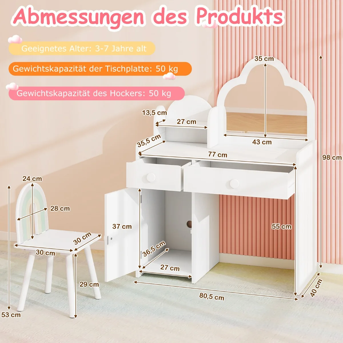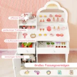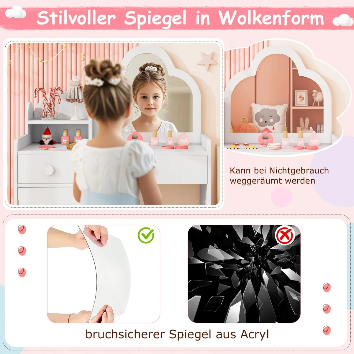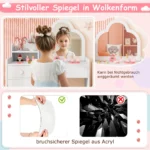 Vaikiškas tualetinis staliukas su kėdute baltos spalvos – funkcionalus ir saugus baldas mažyliams. Komplekte yra tualetinis staliukas su dideliu debesies formos veidrodžiu ir patogi kėdutė, tinkama vaikams nuo 3 iki 7 metų.