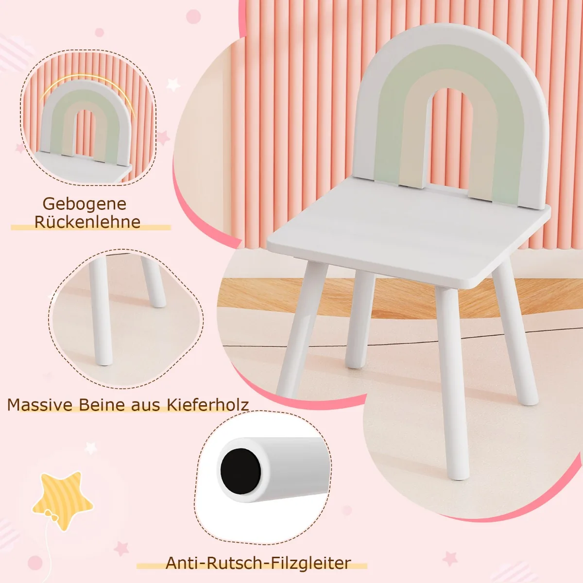 - Taburetė su pušies kojomis ir neslystančiomis pėdų pagalvėlėmis.
