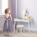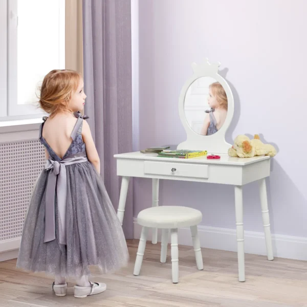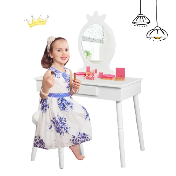Vaikiškas tualetinis staliukas su kėdute, baltos spalvos, puikiai tinka vaikų kambariui ar žaidimų erdvei. Šis tualetinis staliukas pagamintas iš MDF ir pušies medienos, užtikrina patvarumą bei saugumą vaikams nuo 3 iki 8 metų. Komplektas suteikia patogią vietą mokymuisi ir žaidimams.