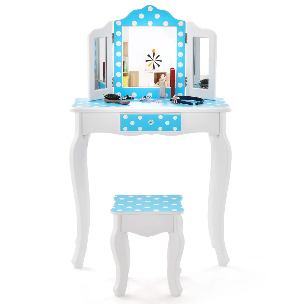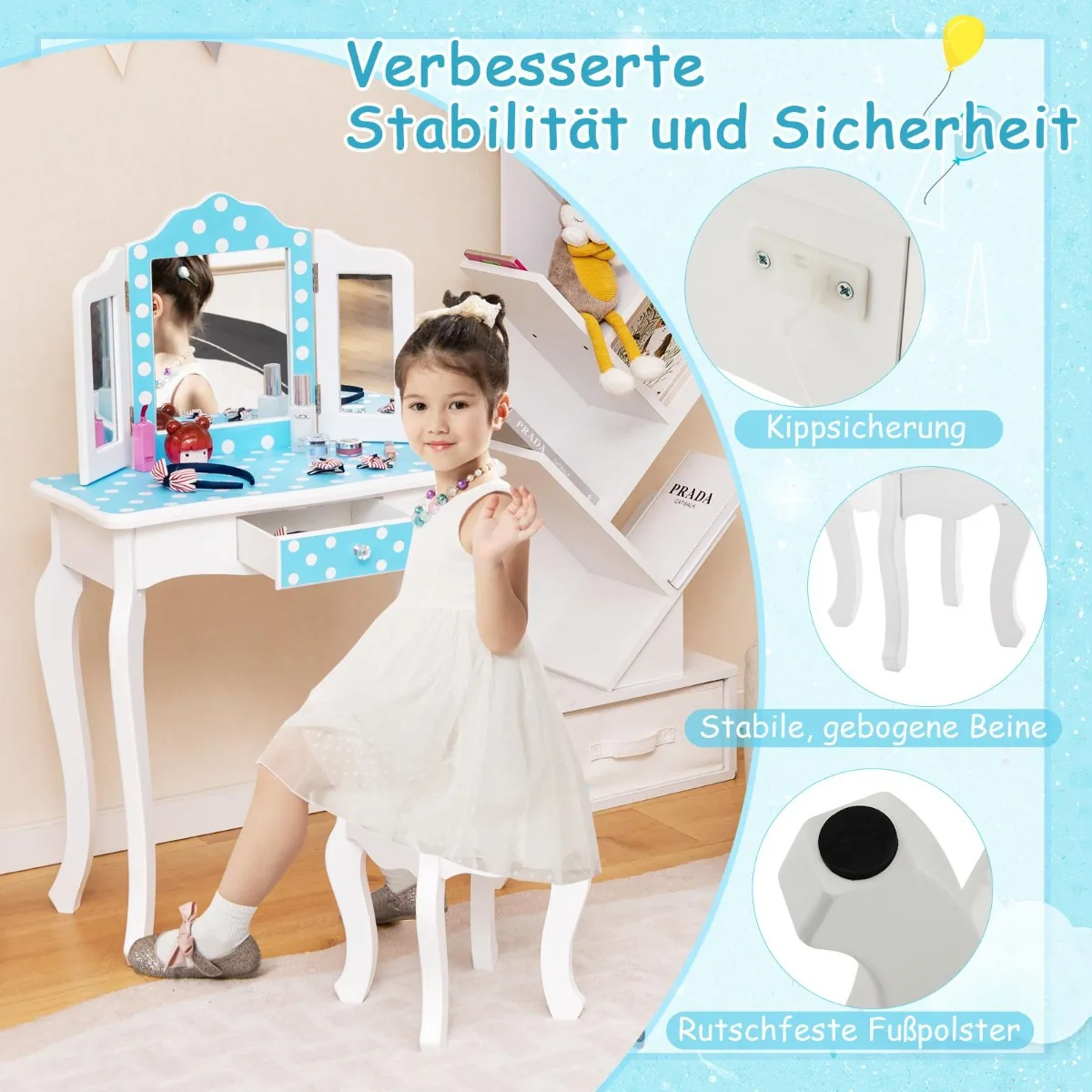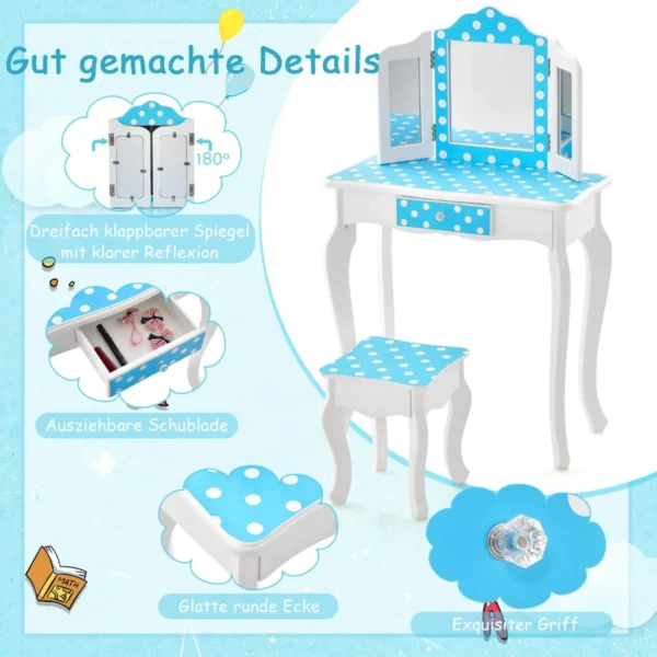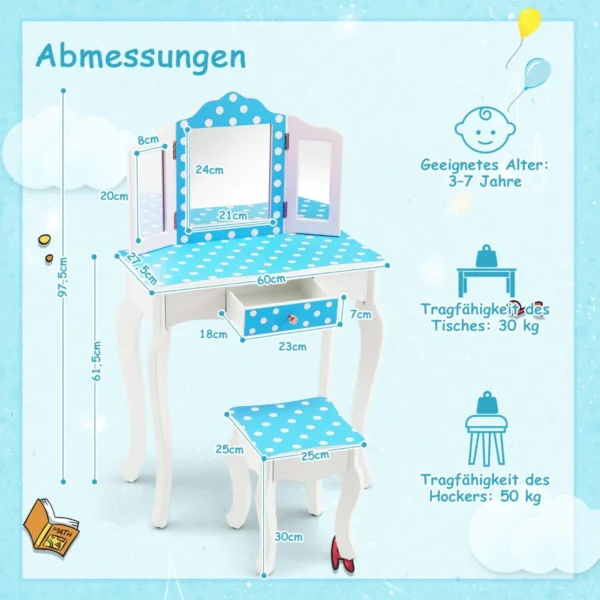 Vaikiškas tualetinis staliukas su kėdute mėlynos ir baltos spalvos puikiai tiks vaikų kambariui arba žaidimų erdvei. Komplektą sudaro staliukas su trigubai sulankstomu veidrodžiu ir patogi taburetė. Staliukas gali būti naudojamas tiek makiažo atlikimui, tiek rašymui nuėmus veidrodį.
