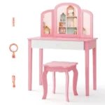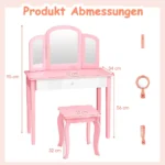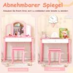 Vaikiškas tualetinis staliukas su kėdute rožinės ir baltos spalvos yra praktiškas ir universalus baldų komplektas vaikų kambariui. Komplektas tinka tiek makiažo ar žaidimų veiklai, tiek kaip rašomasis stalas.