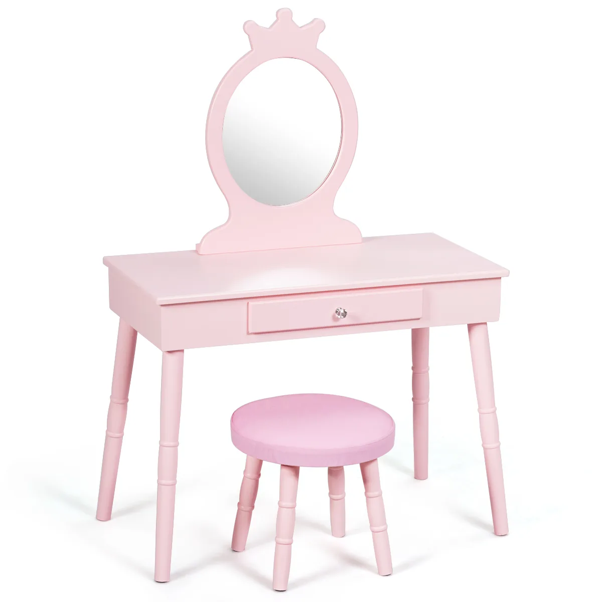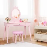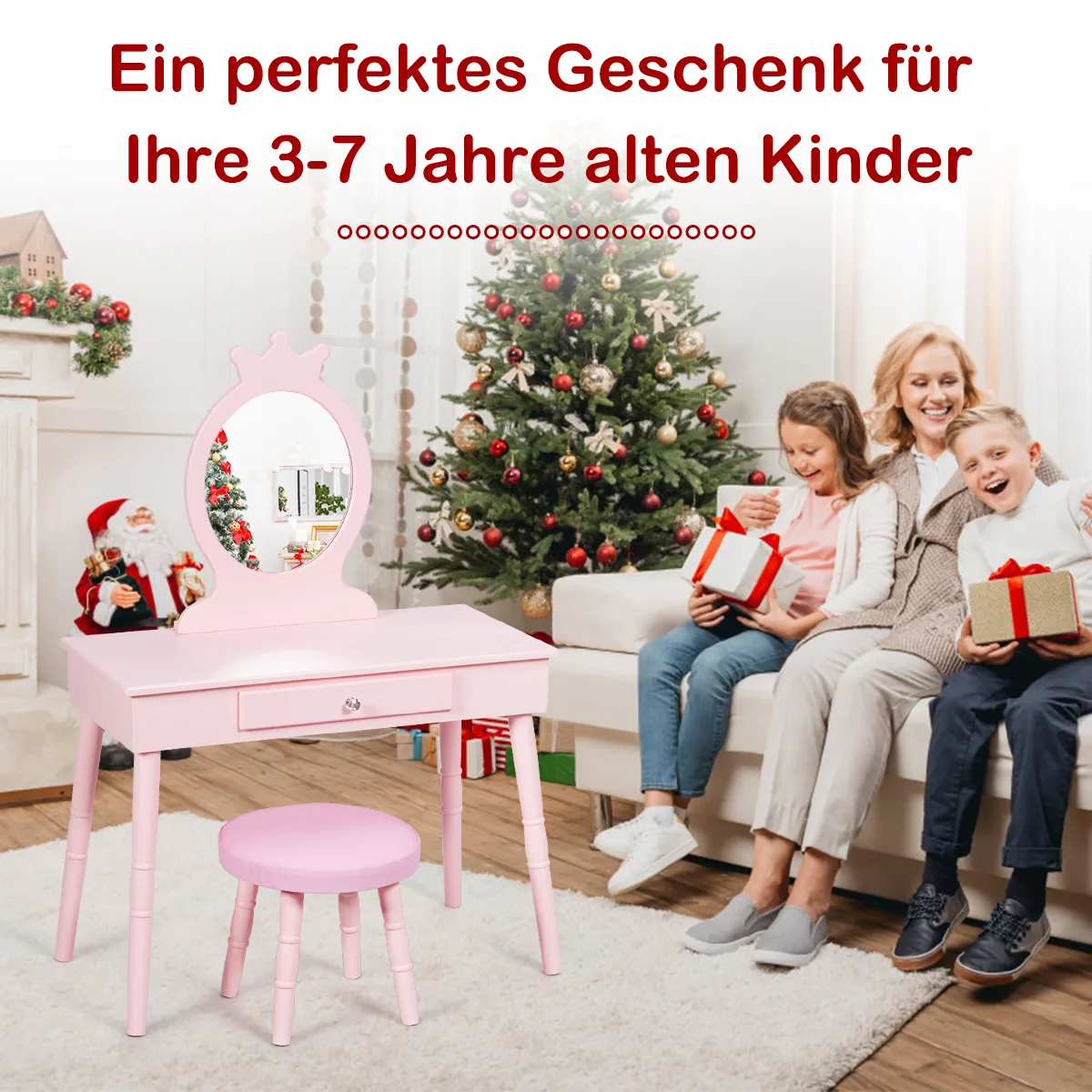 Vaikiškas tualetinis staliukas su kėdute rožinės spalvos skirtas mažoms mergaitėms. Šis kosmetinis rinkinys puikiai tiks vaikų kambariui, padės išsiugdyti tvarkos įprotį ir suteiks saugią vietą žaidimams bei kūrybinei veiklai.