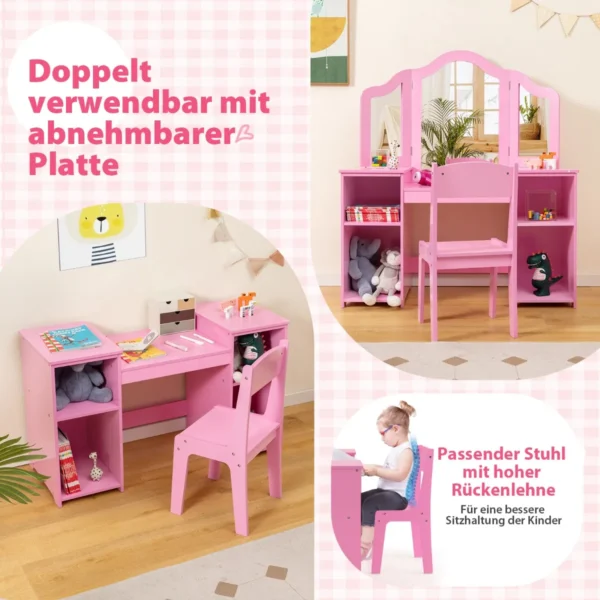 Vaikiškas tualetinis staliukas su kėdute rožinės spalvos skirtas mažoms princesėms. Šis kosmetinis staliukas turi trigubai sulankstomą akrilinį veidrodį ir gali būti naudojamas kaip rašomasis arba kosmetinis stalas vaikams nuo 3 metų. Dėl saugios konstrukcijos ir didelių daiktų laikymo skyrių jis puikiai tinka vaikų veikloms ir daiktų organizavimui.