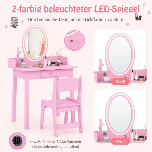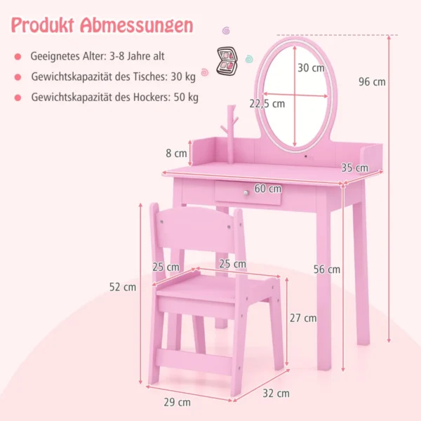 Vaikiškas tualetinis staliukas su kėdute rožinės spalvos yra puikus pasirinkimas vaikams nuo 3 iki 8 metų. Šis komplektas suteikia saugų ir patogų žaidimų bei mokymosi kampelį, puikiai tinkantį miegamajam ar žaidimų kambariui. LED apšviestas veidrodis ir didelė saugojimo vieta leidžia vaikams kūrybiškai leisti laiką.