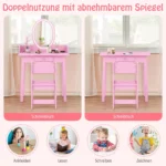 - Vaikiškas tualetinis staliukas su nuimamu veidrodžiu, kurį galima naudoti kaip stalą.