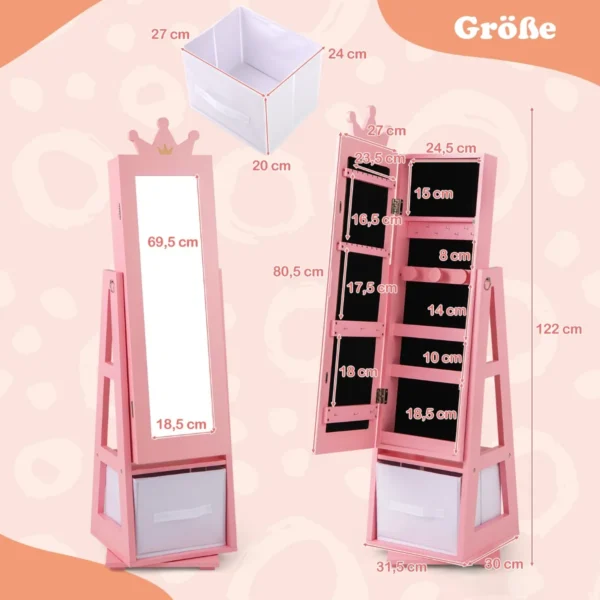 Vaikiškas veidrodis 31,5x30x122 cm rožinės ir juodos spalvos – praktiškas sprendimas vaikų kambario organizavimui. Šis veidrodis su integruota papuošalų spintele puikiai tinka laikyti auskarus, apyrankes, žiedus ir kitus aksesuarus bei patogiai juos patikrinti viso ūgio veidrodžio pagalba.
