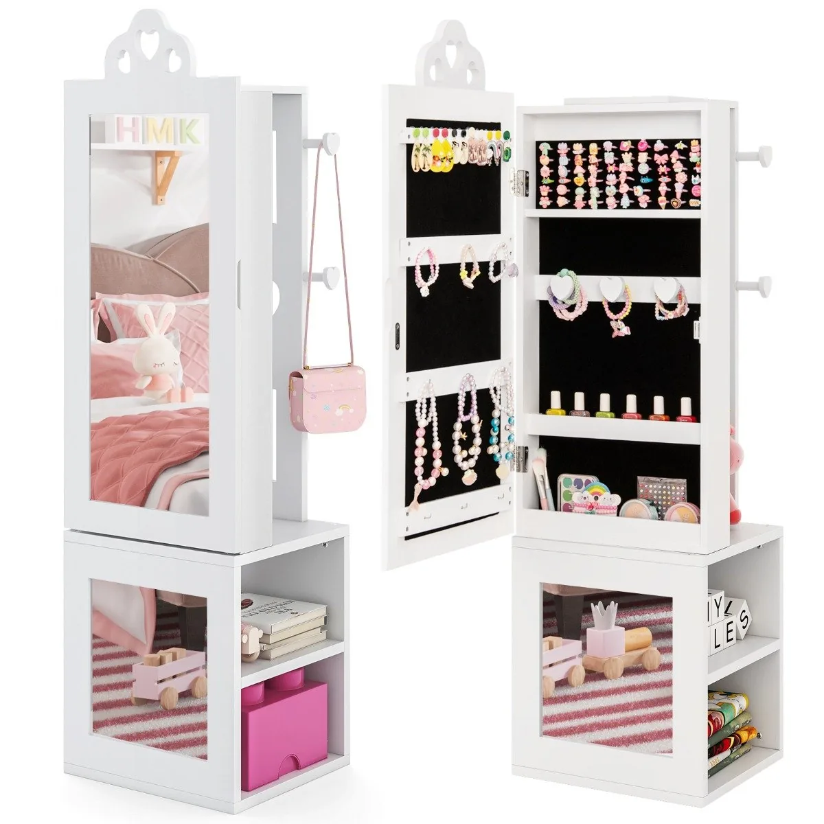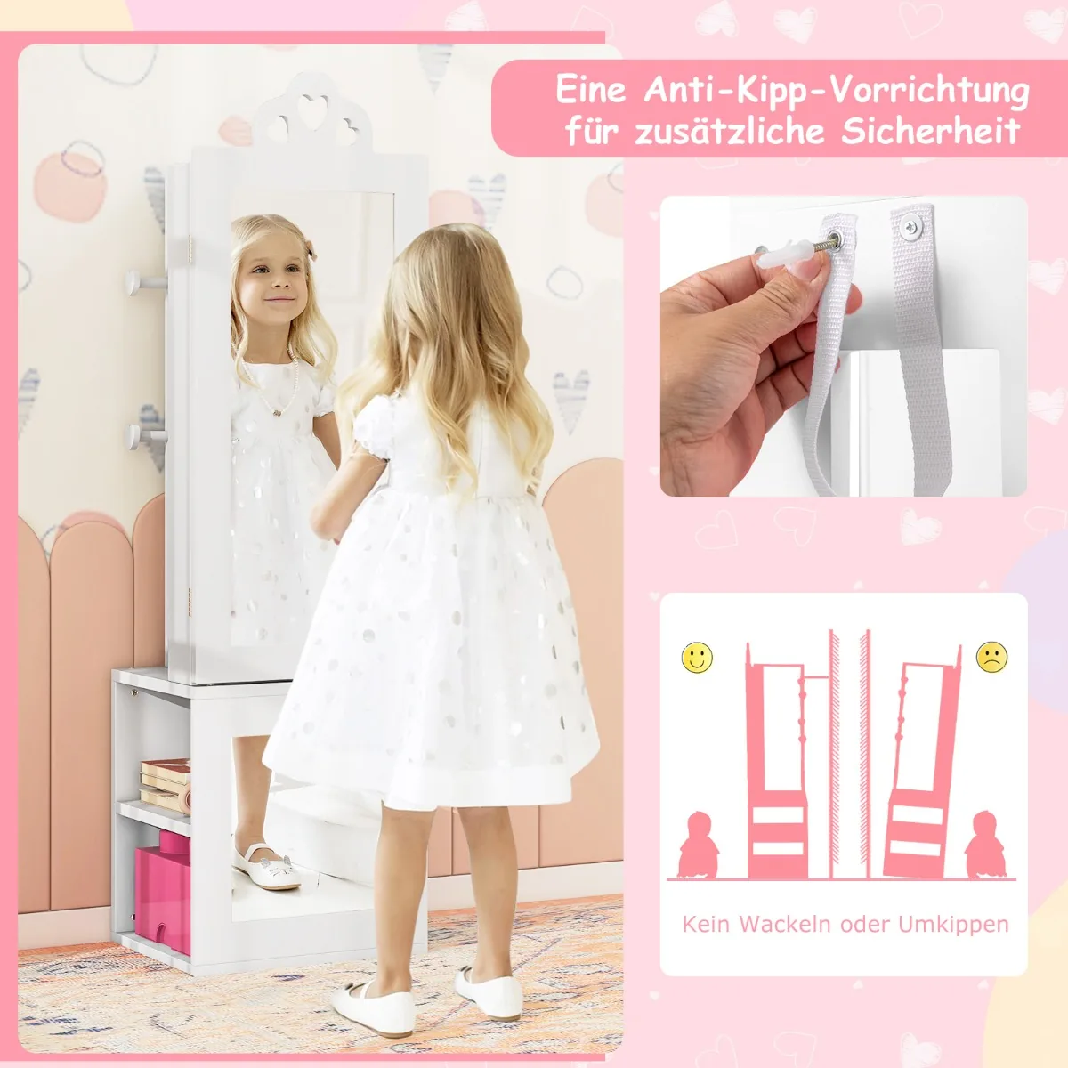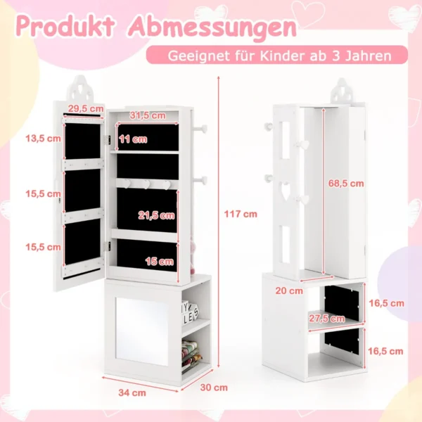 Vaikiškas veidrodis 34x30x117cm, baltos ir juodos spalvos, yra praktiškas sprendimas vaikų kambariui. Šis universalus baldas sujungia papuošalų spintelę, viso ilgio veidrodį ir drabužių kabyklą, padedant išlaikyti tvarką ir funkcionalumą. Jis pritaikytas vaikų mados poreikiams ir užtikrina saugų naudojimą.