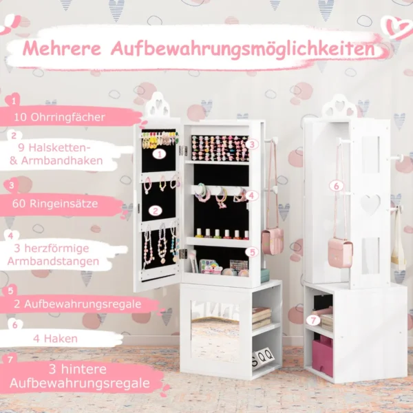 - 10 auskarų skyrių, 9 karolių ir apyrankių kabliukai, 60 žiedų skyrių, 3 širdies formos apyrankių strypai ir 2 lentynos.