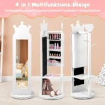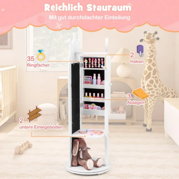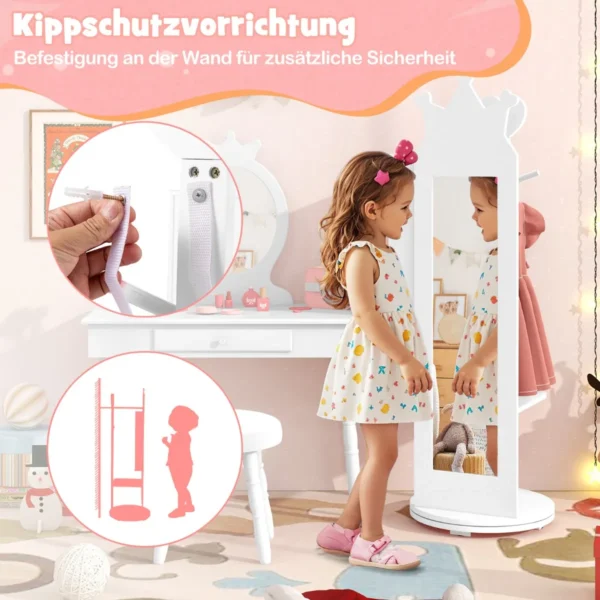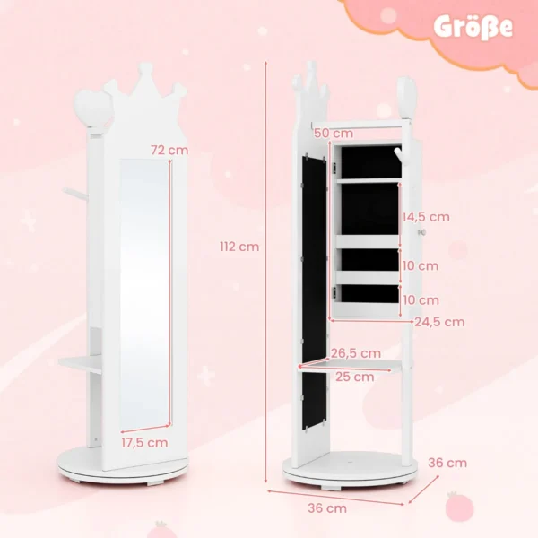 Vaikiškas veidrodis 36x36x112cm, baltos spalvos, puikiai tinka vaikų kambariui. Šis daugiafunkcis veidrodis su papuošalų spintele ir drabužių kabykla suteikia patogią vietą aprangos patikrai bei daiktų saugojimui.