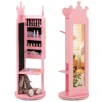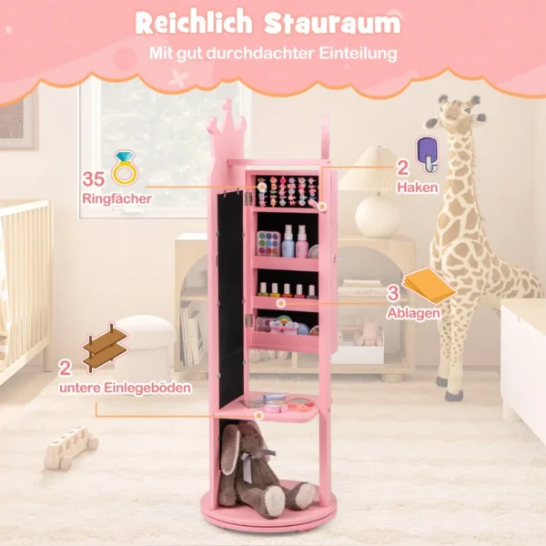 Vaikiškas veidrodis 36x36x112cm rožinės spalvos yra praktiškas ir daugiafunkcis sprendimas vaikų kambariui. Šis veidrodis su integruota papuošalų spintele ir drabužių kabyklomis suteikia patogią vietą daiktams laikyti ir aprangai tikrinti viso ilgio veidrodyje. Dėl 360° besisukančio pagrindo veidrodis yra lengvai pasiekiamas ir patogus naudoti.