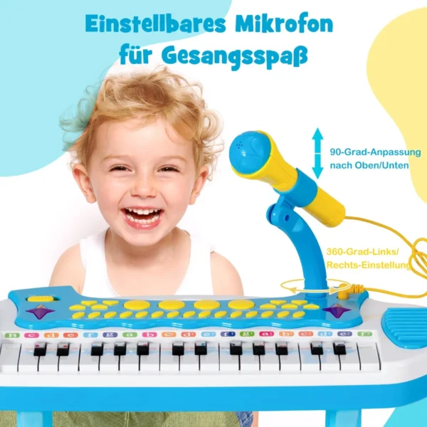 Vaikiškas žaislinis pianinas su kėde – puikus muzikos instrumentas vaikams nuo 3 metų. Šis pianinas padeda lavinti muzikinius įgūdžius, atmintį ir rankų bei akių koordinaciją. Jis lengvai pernešamas ir turi reguliuojamą mikrofoną bei patogią taburetę.