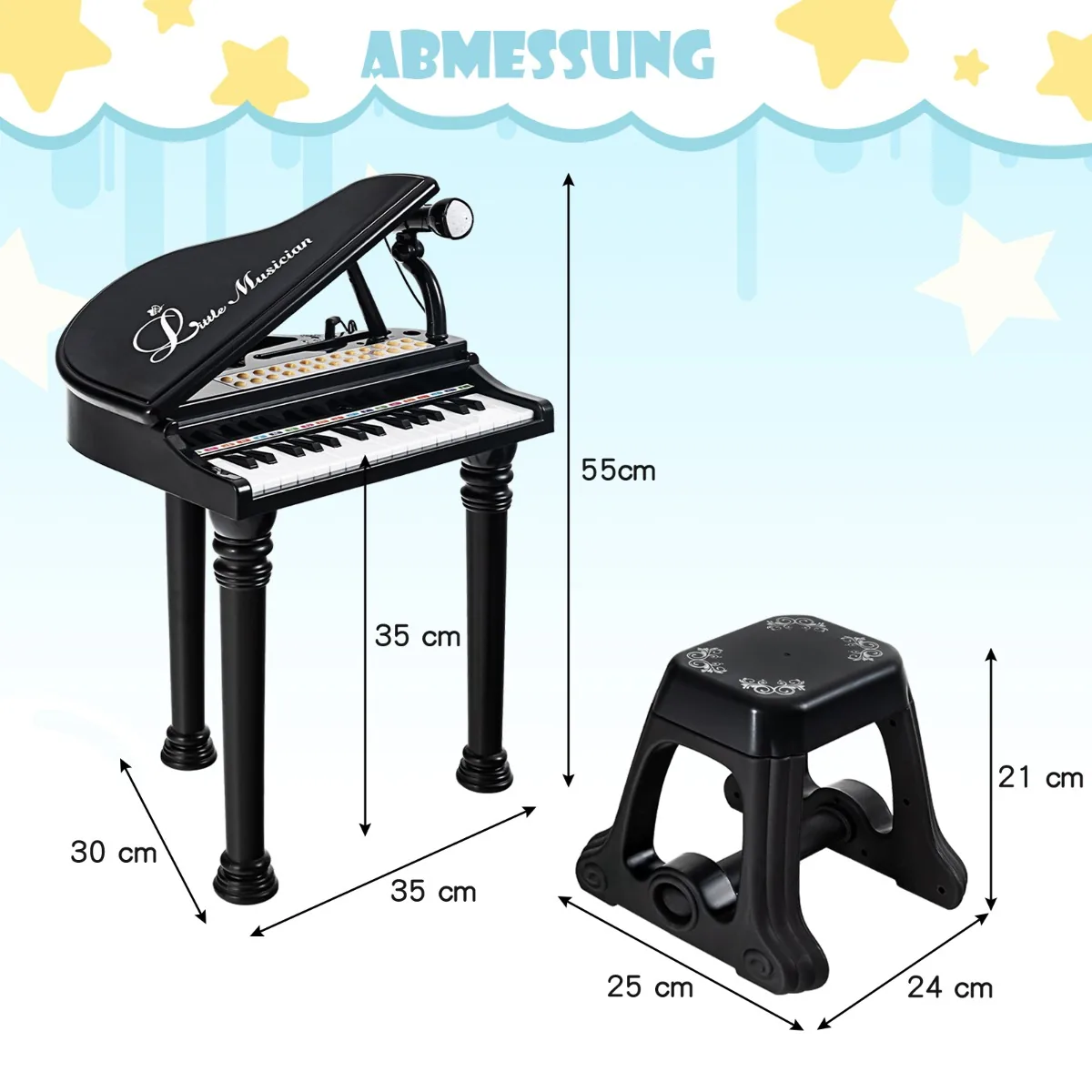 - Fortepijono matmenys: 35 x 30 x 55 cm (I x P x A).