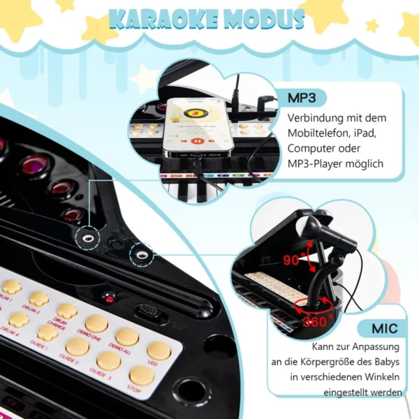 Vaikiškas žaislinis pianinas su kėde, juodos ir baltos spalvos, puikiai tinka vaikams nuo 3 metų muzikinėms pamokoms ir pramogoms. Šis 31 klavišo pianinas suteikia galimybę mokytis groti, naudojant LED apšvietimą ir įvairias muzikines funkcijas, skatinančias kūrybiškumą ir klausos suvokimą.