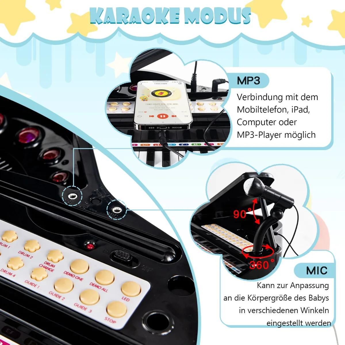- 1 x žaislinis pianinas su klaviatūra.