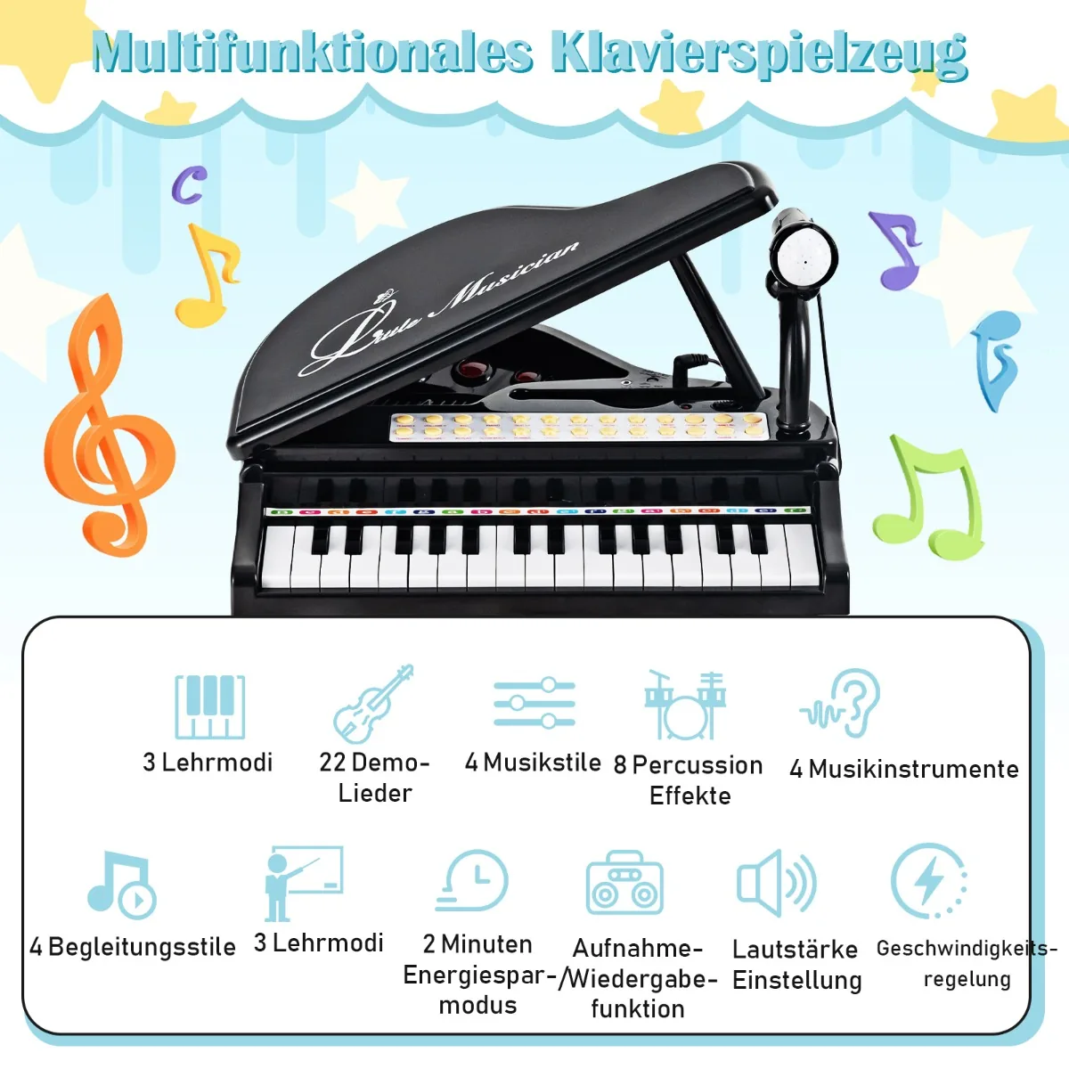 - 31 klavišo žaislinis pianinas su juodai baltomis klavišais ir LED mokymo režimu.