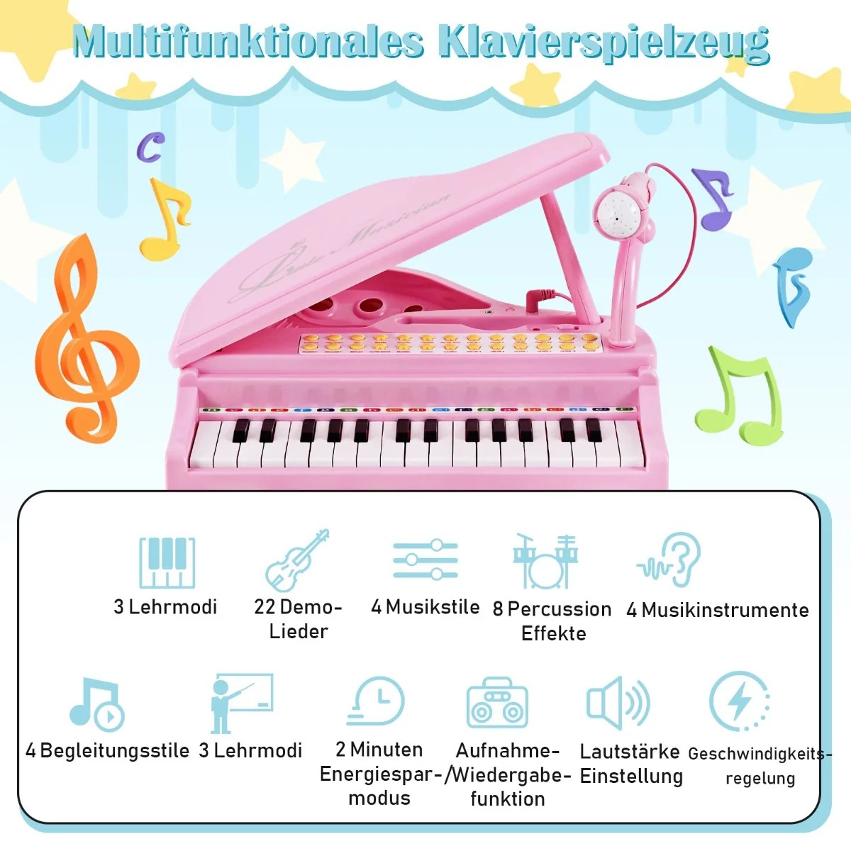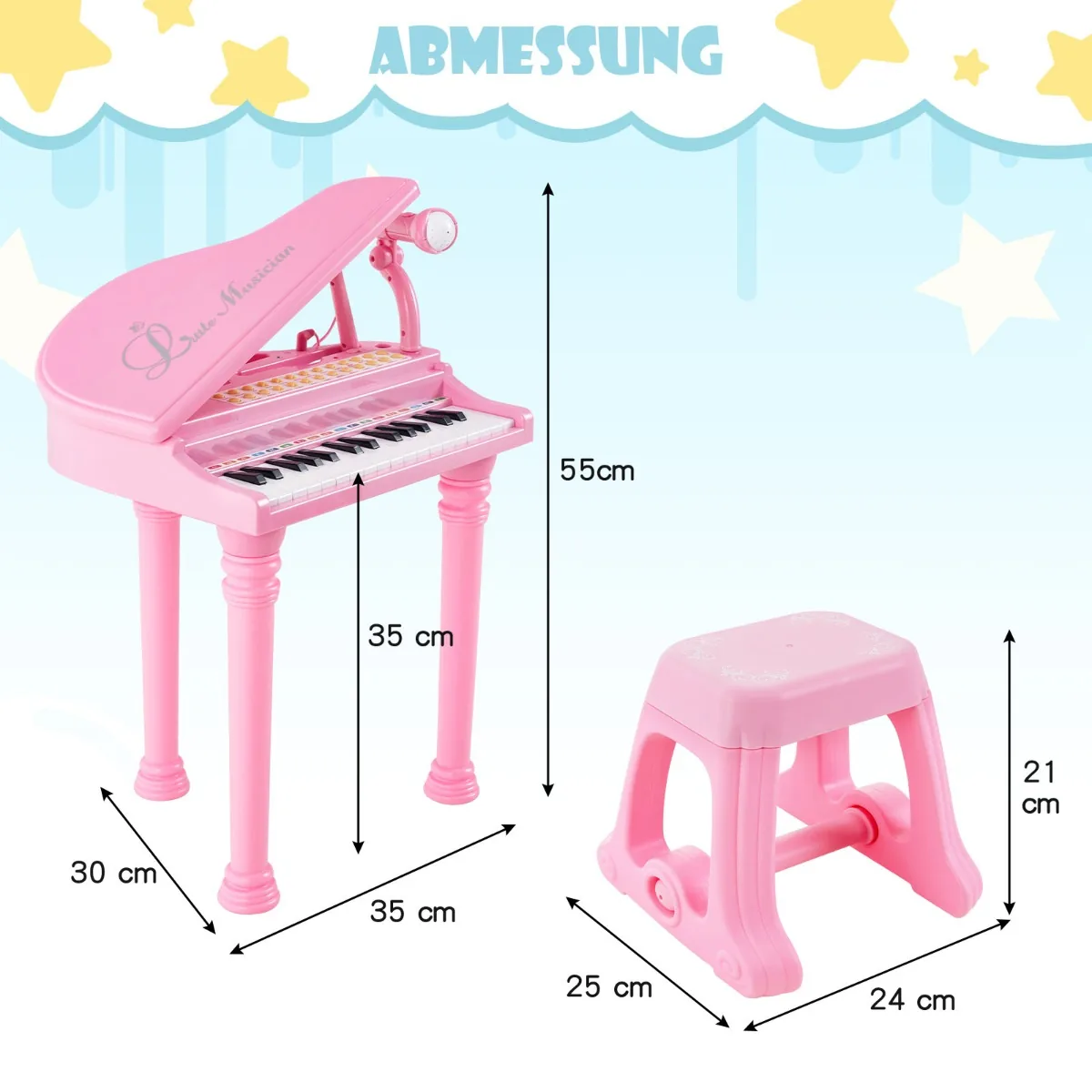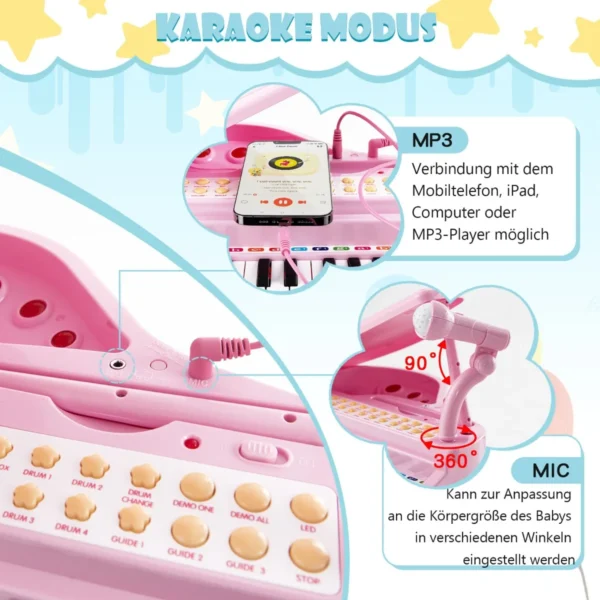 Vaikiškas žaislinis pianinas su kėde rožinės ir baltos spalvos skirtas vaikams nuo 3 metų. Šis 31 klavišo pianinas suteikia galimybę pažinti muzikos pasaulį per interaktyvias pamokas ir įvairias garso funkcijas. Pianinas turi MP3 ir mikrofono jungtis, todėl vaikai gali ne tik groti, bet ir dainuoti.